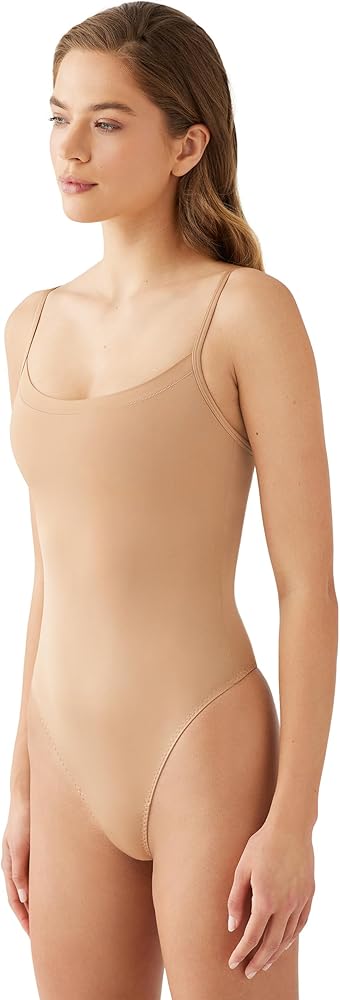 Allover soft thong-back bodysuit. Features self-fabric shelf lining at bust, fully adjustable straps & cotton gusset.