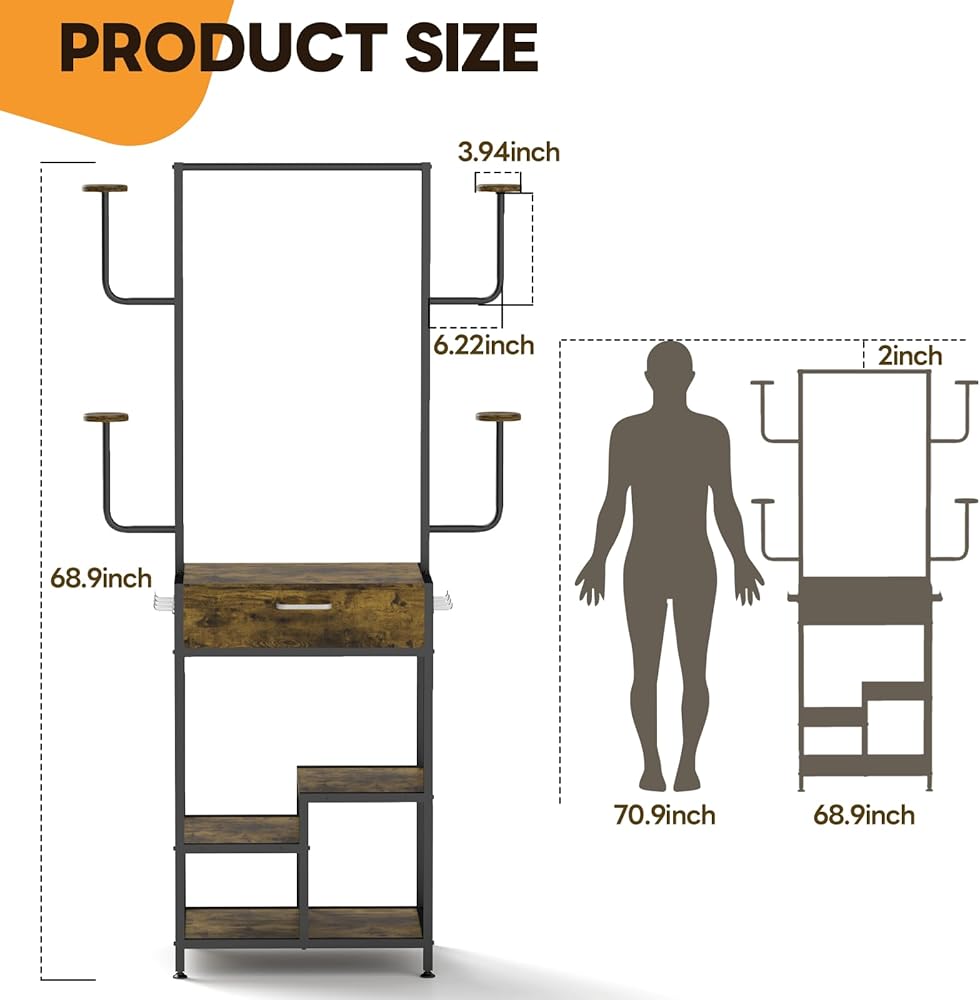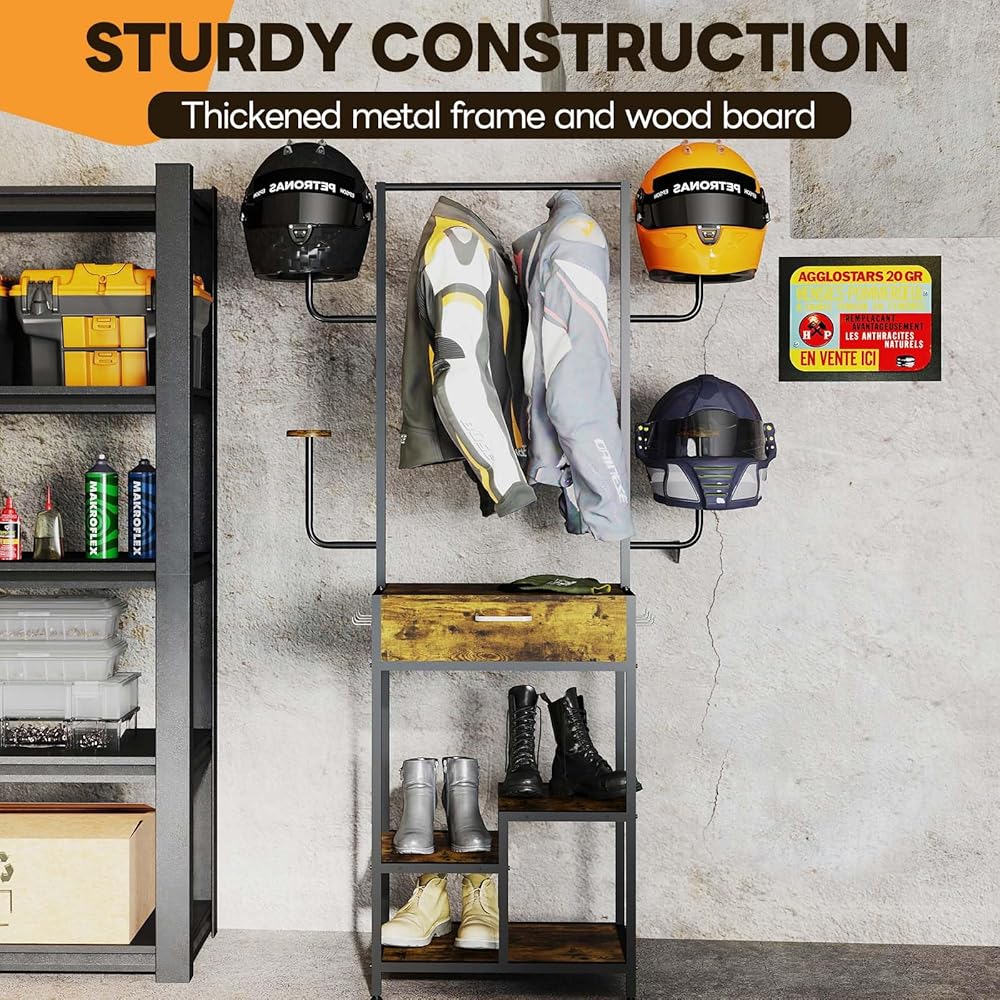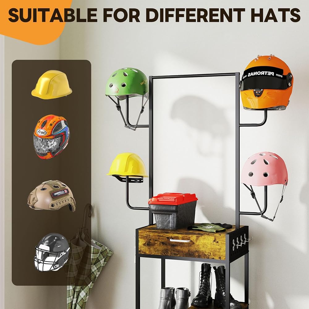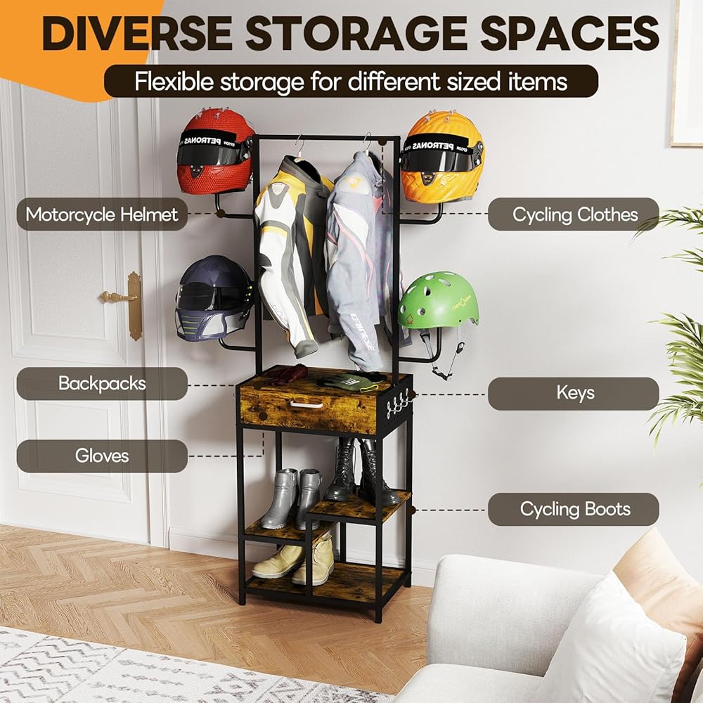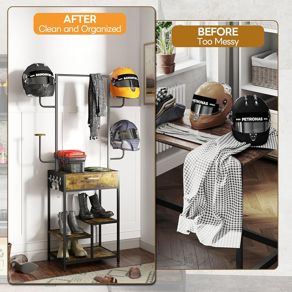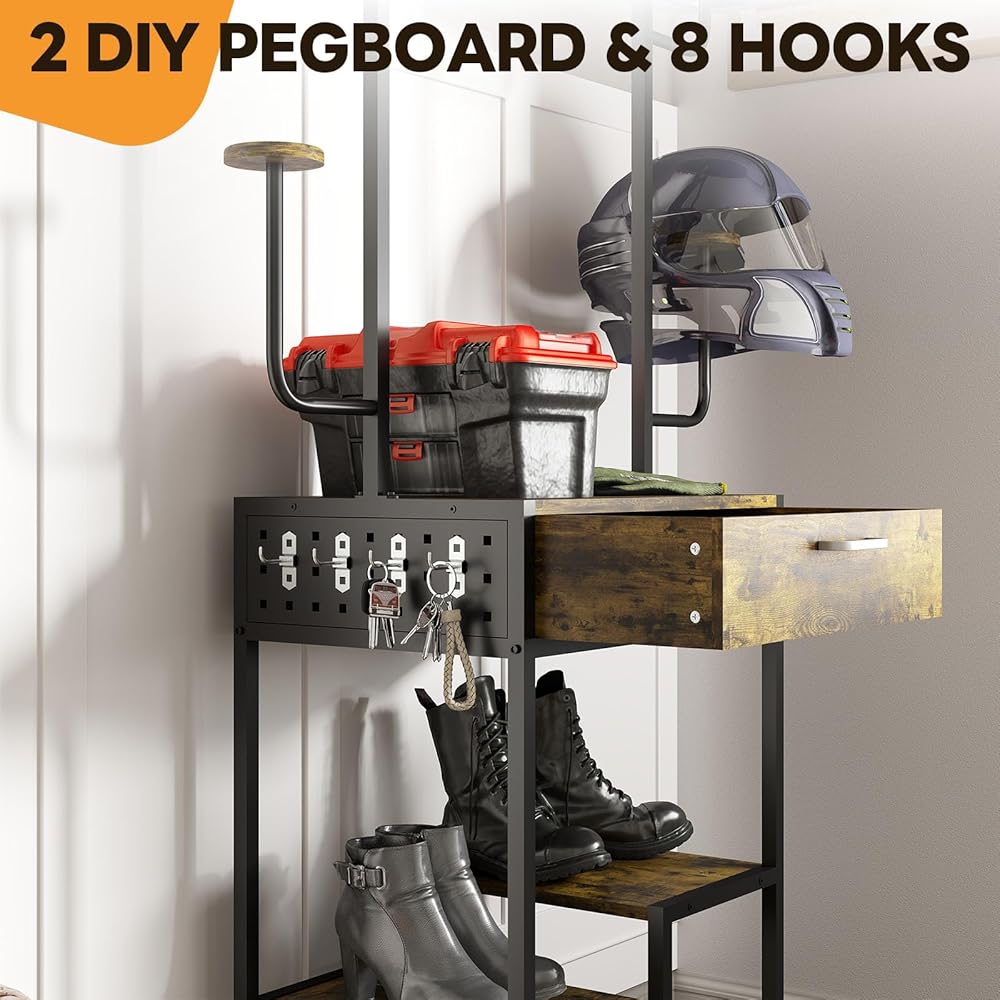تصميم متعدد الوظائف: رف خوذة الدراجة النارية مجهز بـ 4 دعامات لحامل الخوذة، ودرج، ولوح تعليق جانبي DIY و8 خطافات، ورف تخزين عرض الأحذية من 3 طبقات وقضيب تجفيف الملابس يوفر لك المزيد من خيارات التخزين والمساحة