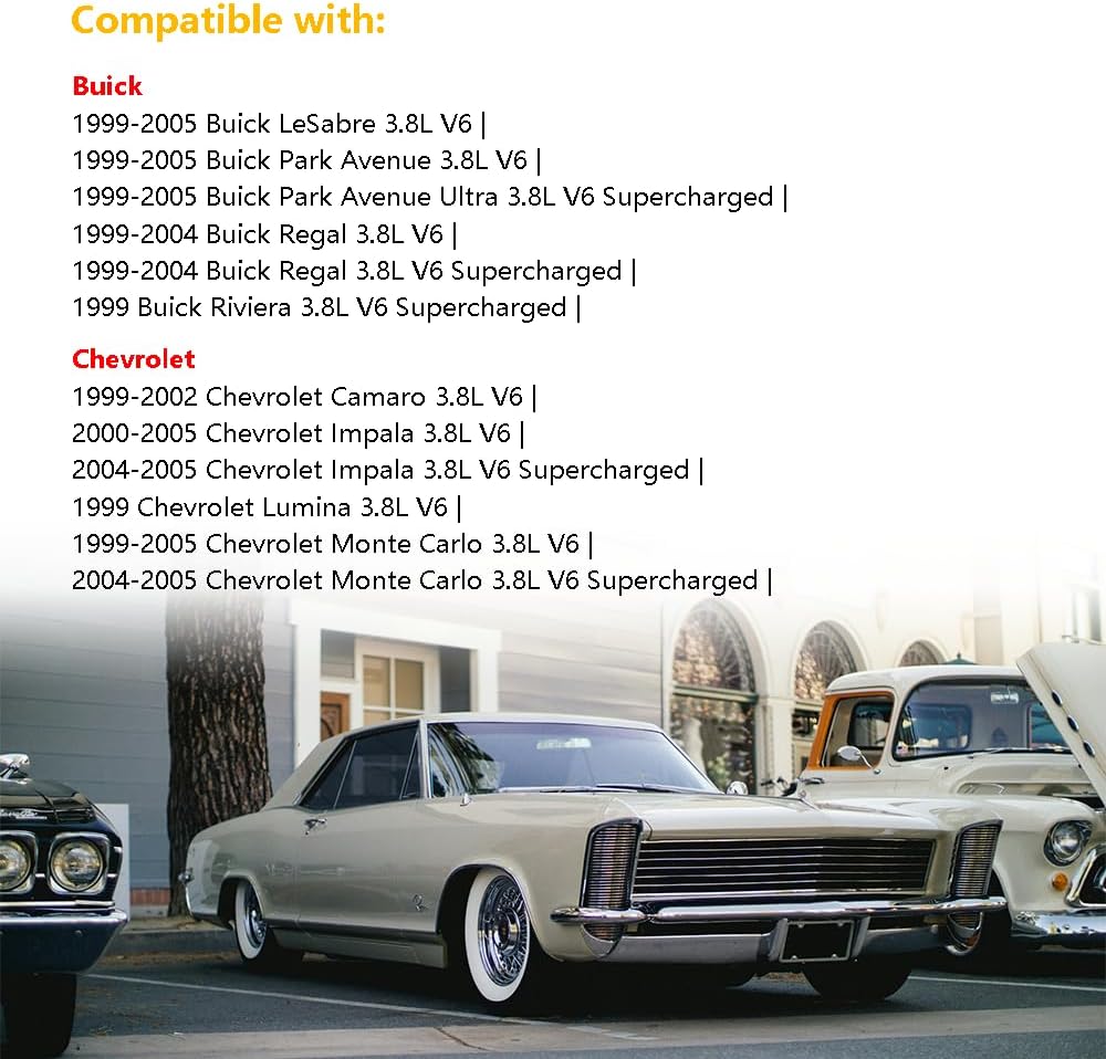 Compatible with: Chevrolet (Chevy) | 1999-2002 Chevrolet Camaro 3.8L V6 | 2000-2005 Chevrolet Impala 3.8L V6 | 2004-2005 Chevrolet Impala 3.8L V6 Supercharged | 1999 Chevrolet Lumina 3.8L V6 | 1999-2005 Chevrolet Monte Carlo 3.8L V6 | 2004-2005 Chevrolet Monte Carlo 3.8L V6 Supercharged |