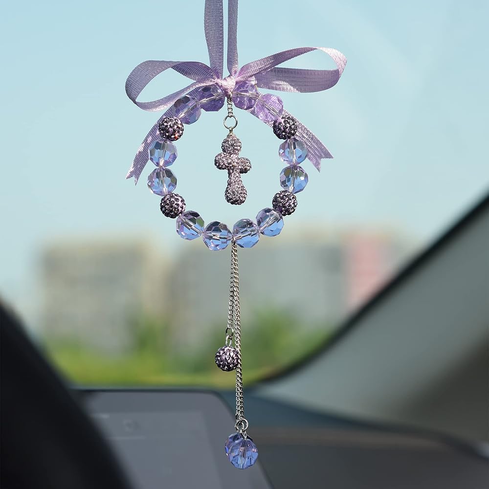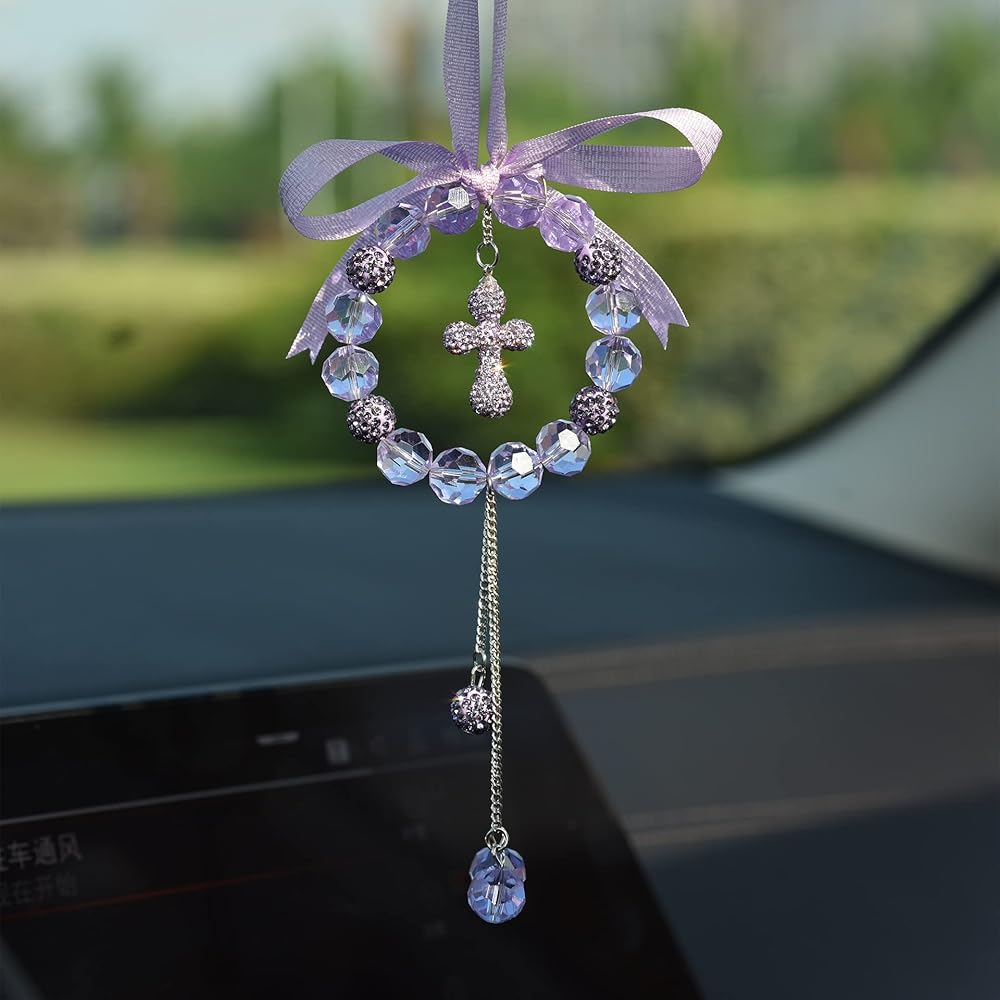 قلادة INEBIZ Bling Car Charm حلية معلقة مطرزة بالكريستال لتزيين مرآة الرؤية الخلفية (صليب أرجواني)