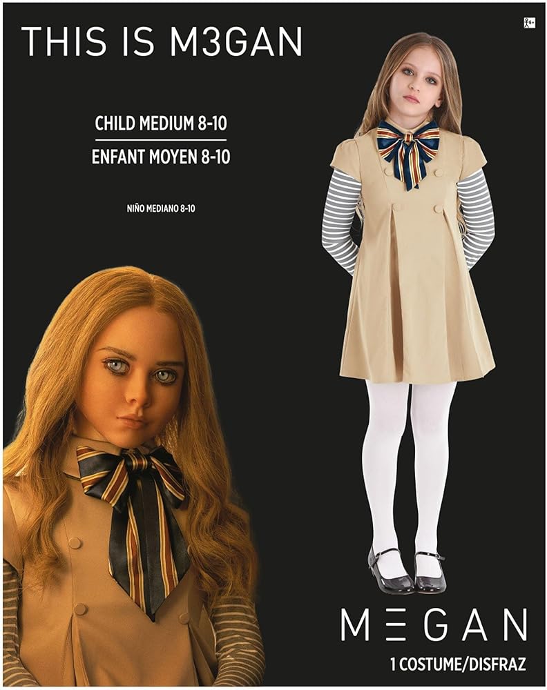 Eerie Charm: Party City's Kids' M3GAN Costume lets kids capture the haunting allure of M3GAN. This two-piece set includes a signature dress and coordinating tights. Size M.