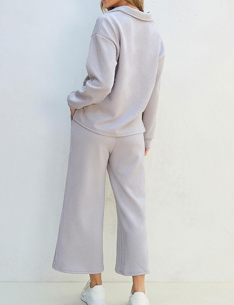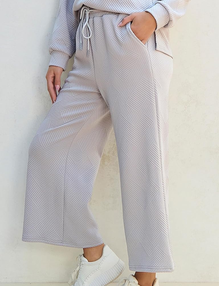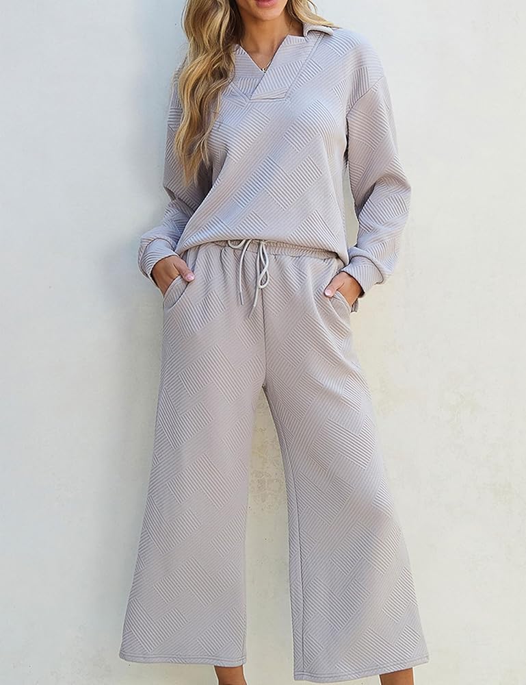 تتميز السترة النسائية بمقاس مريح مع خط عنق على شكل حرف V وأكمام طويلة وكتف منسدل. يكمل البنطلون المطابق المظهر بقصته الجذابة وحزام الخصر المرن الذي يضمن ملاءمة مثالية. مصمم بجيوب عملية وأرجل واسعة