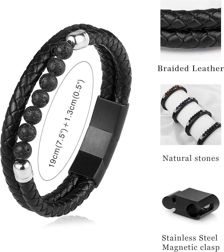 المواد: الجزء الجلدي منسوج من الجلد الطبيعي، والحجر الطبيعي عبارة عن حجر عين النمر الطبيعي مقاس 6 مم، والقفل المغناطيسي مصنوع من الفولاذ المقاوم للصدأ 316L، والسوار بأكمله خالٍ من الرصاص والنيكل، ولا يسبب الحساسية، ومناسب جدًا للارتداء اليومي للرجال.