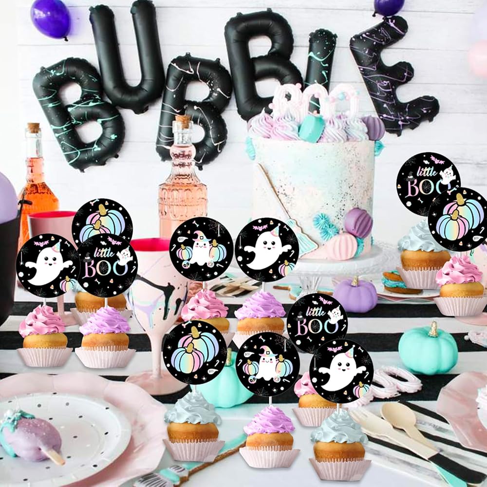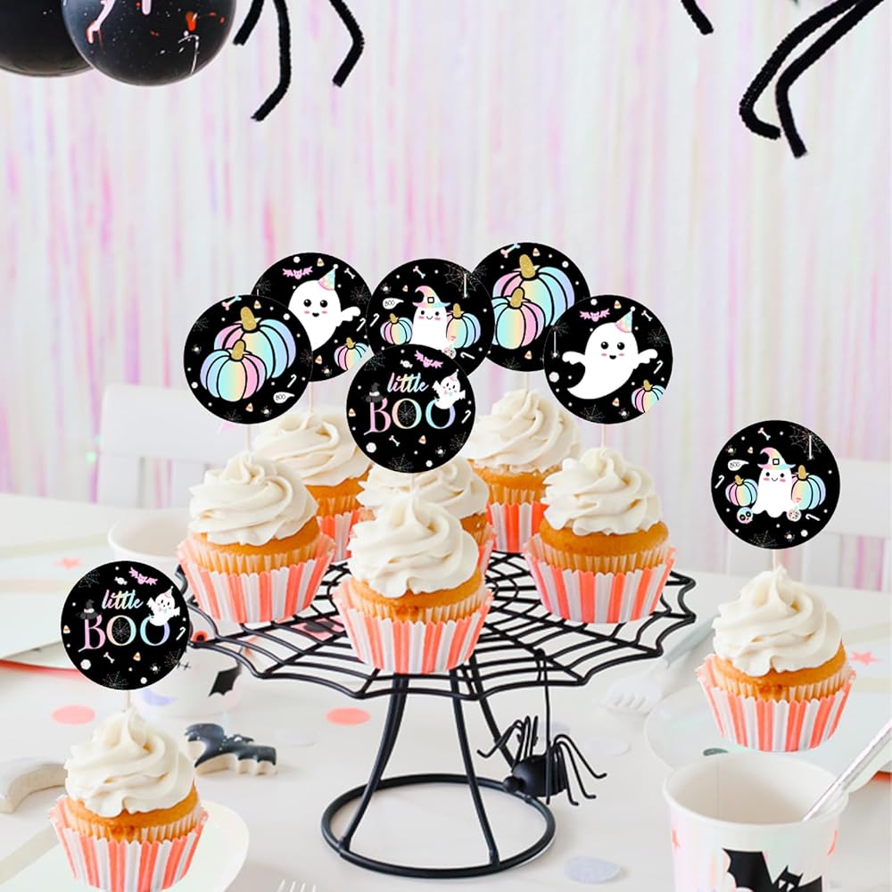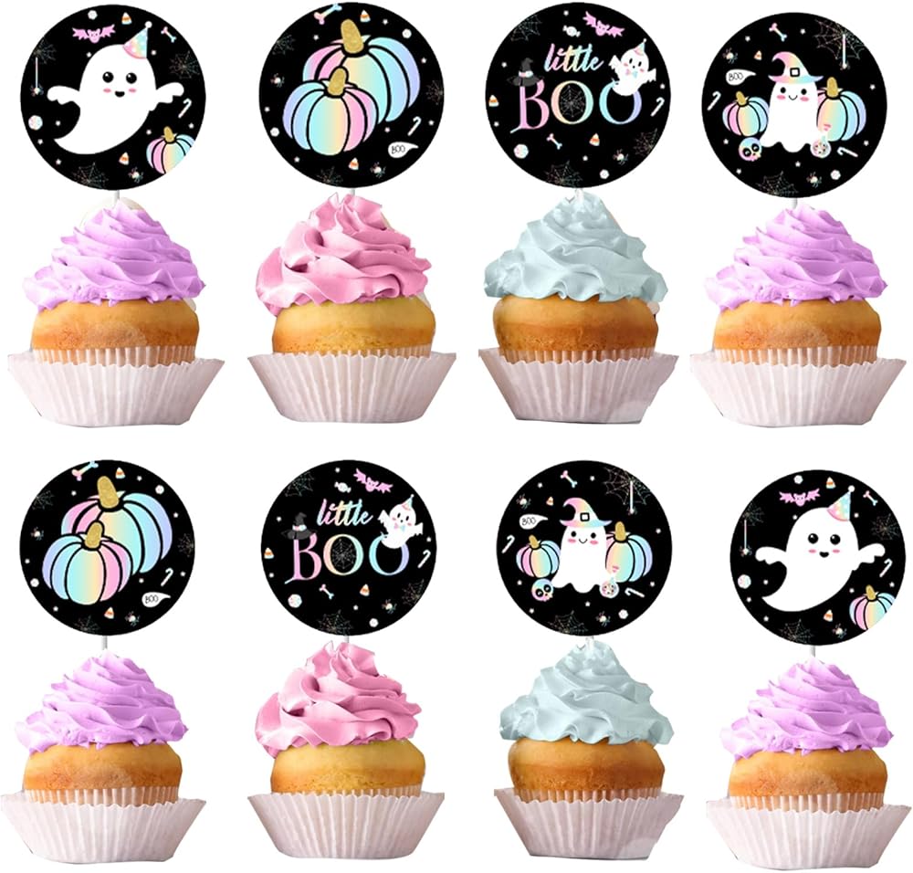 Cute Halloween Little Boo Gender Reveal Party Decorations: Perfect party dessert table cupcake toppers decors for Halloween ghost baby shower party, gender reveal party, 1st/2rd girl's birthday party, pregnancy announcement party, a celebration party to welcome a newborn baby girl.