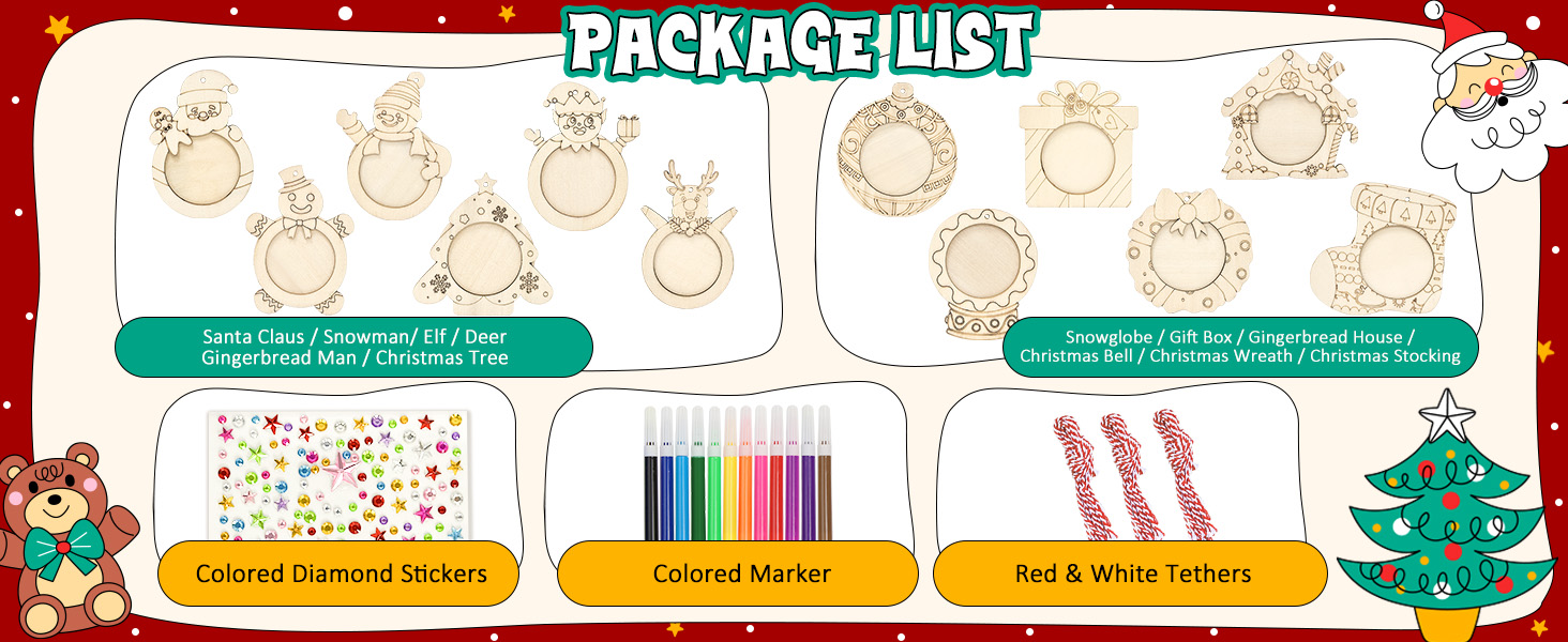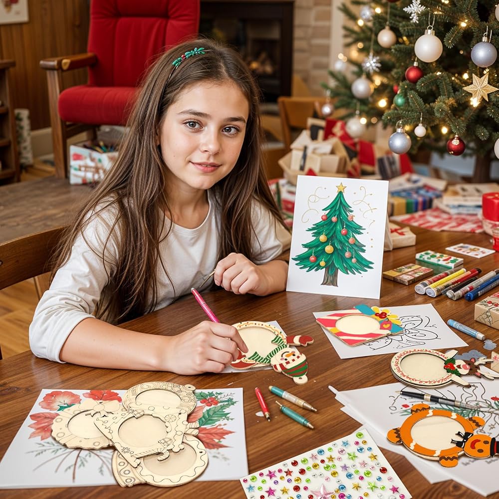 【متعة إبداعية لجميع الأعمار】أطلق العنان لذوقك الفني مع 24 إطار صورة خشبي غير مكتمل من زينة عيد الميلاد في 12 نمطًا فريدًا، مثالية للأطفال والكبار للاستمتاع بصنع حرف عيد الميلاد معًا! بالإضافة إلى ذلك، فإن قلم التحديد الملون وملصقات النجوم اللطيفة والأربطة التي تحتوي على كل ما يلزم لصنع إطار صورة عيد الميلاد كلها متضمنة في العبوة.