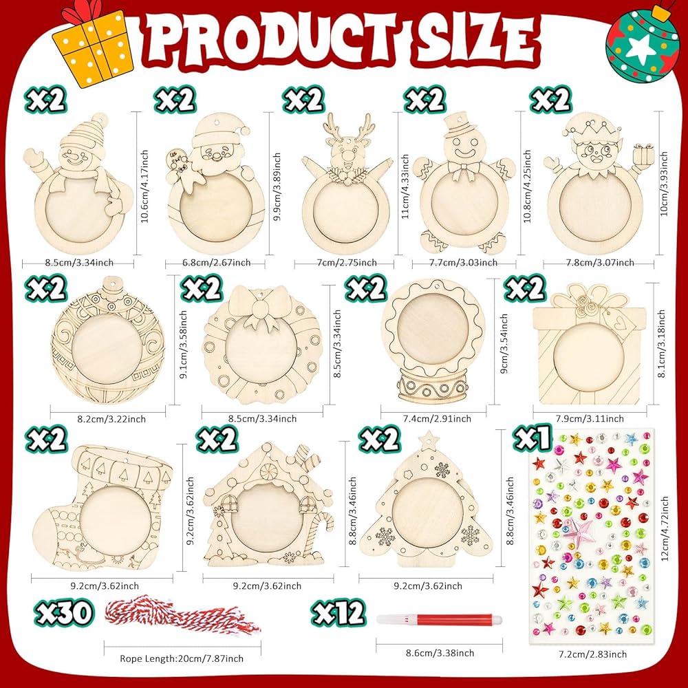 24 قطعة من إطار صور عيد الميلاد الخشبي غير المكتمل من AerWo، 12 نمطًا من إطار صور عيد الميلاد DIY زخارف خشبية لشجرة عيد الميلاد للطلاء باستخدام ملصقات وحبال ملونة، مجموعات حرفية عيد الميلاد المضحكة للأطفال البالغين