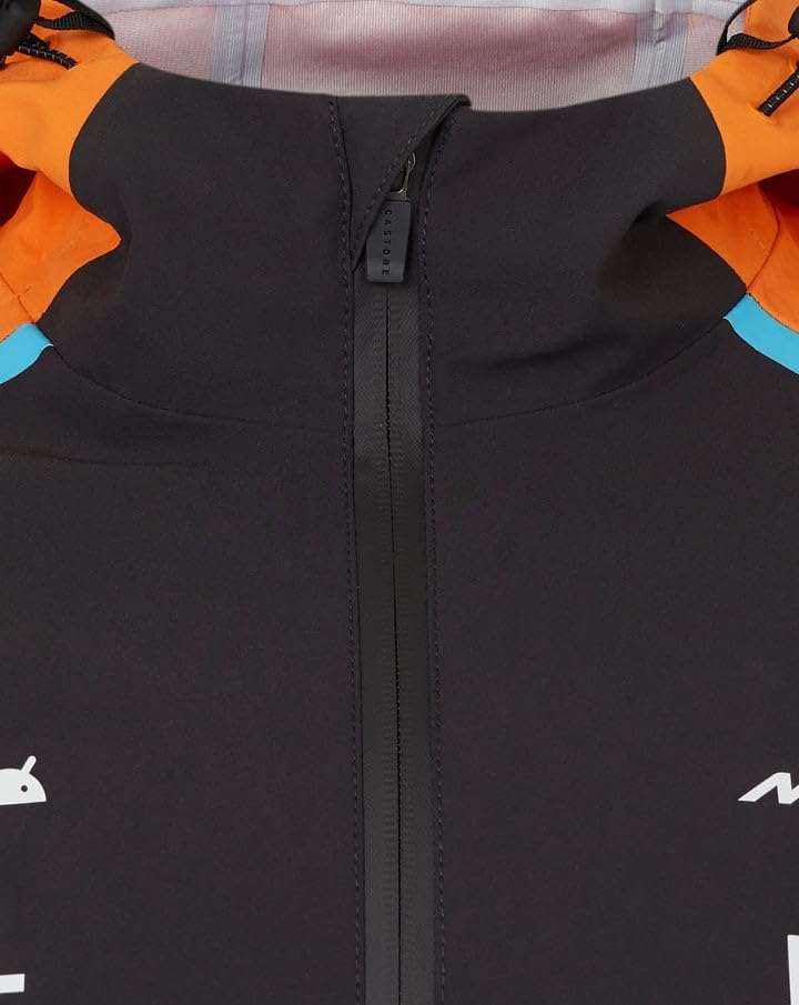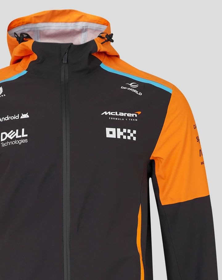 McLaren F1 Team Lightweight Rain Jacket 2024 This Team Official Team McLaren F1 Team Lightweight Rain Jacket is engineered with waterproof fabric and pockets to keep your body and belongings dry. Always stay seen on and off the track with reflective modifications throughout, with a multi-adjustable peaked hood for additional comfort when you need it most. Waterproof fabric with sealed seams, Hood with front peak, matte toggles, contrast bungee cord, and adjuster, Set-in long sleeves with elasticated cuffs, Waterproof centre front full zip, Concealed side pockets, Contrast taping at shoulders and waist, Reflective Speed mark logo at lower back, Team sponsors and logos at front, sleeves, and back. Material: 100% polyester
