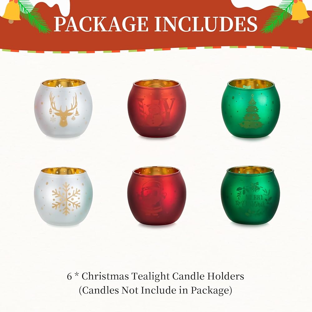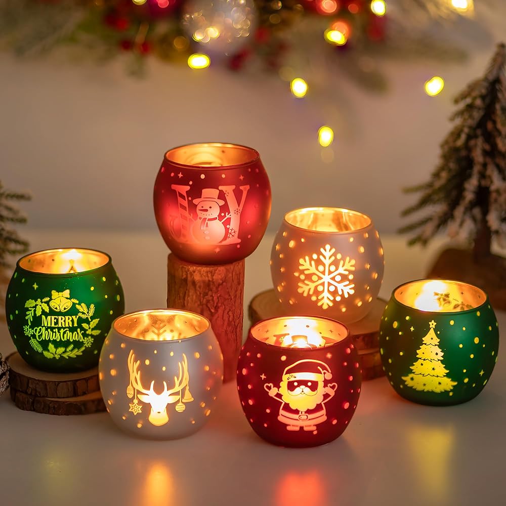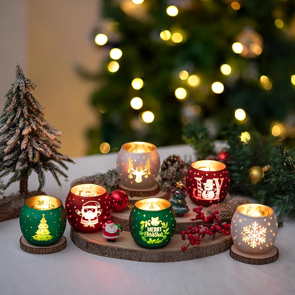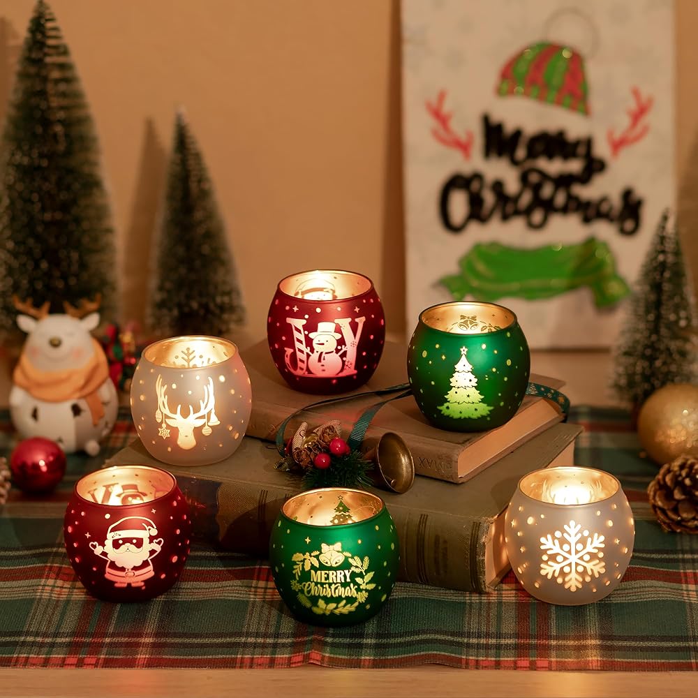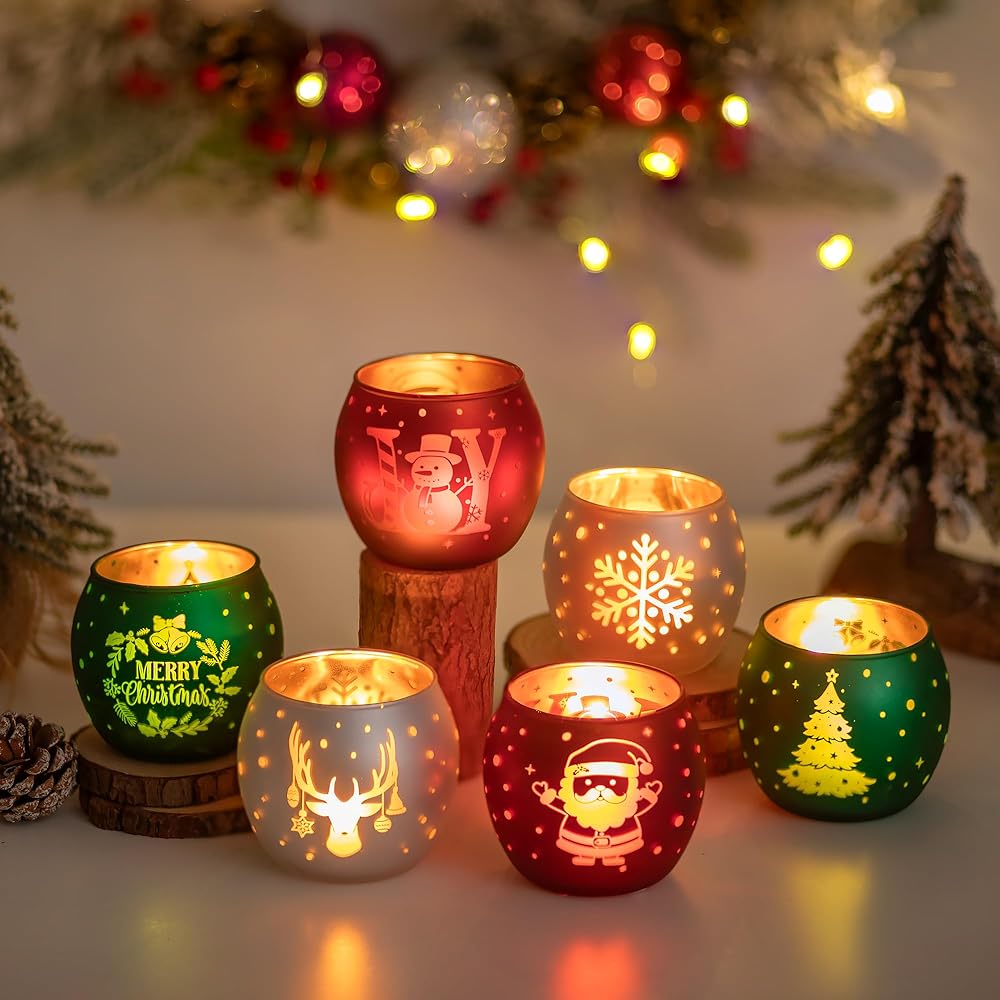 • حامل شموع عيد الميلاد: انغمس في الروح الاحتفالية مع هذه المجموعة الجميلة المكونة من 6 حاملات شموع خفيفة للشاي. تم تصميم كل حامل شموع شاي بعناية واهتمام بالتفاصيل. تم تزيين كل حامل شموع عتيق بلوحة عيد الميلاد المثالية باللون الأحمر والأخضر والأبيض، مع إبرازها بنقوش ذهبية. من أشجار عيد الميلاد وسانتا كلوز إلى رجال الثلج، ورقائق الثلج، وحيوانات الرنة، فإن كل حامل شموع من الزجاج الزئبقي هو احتفال ببهجة الموسم ودفئه.