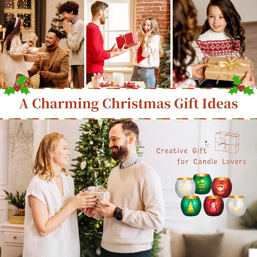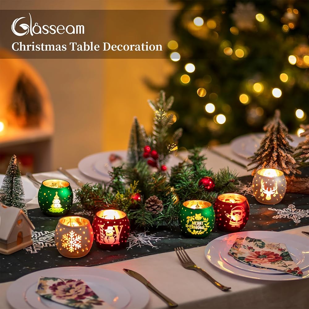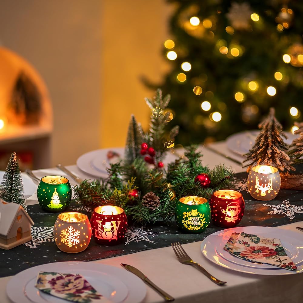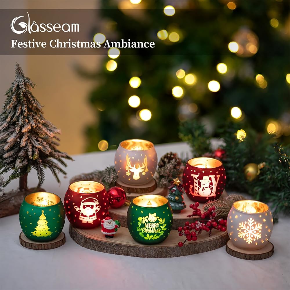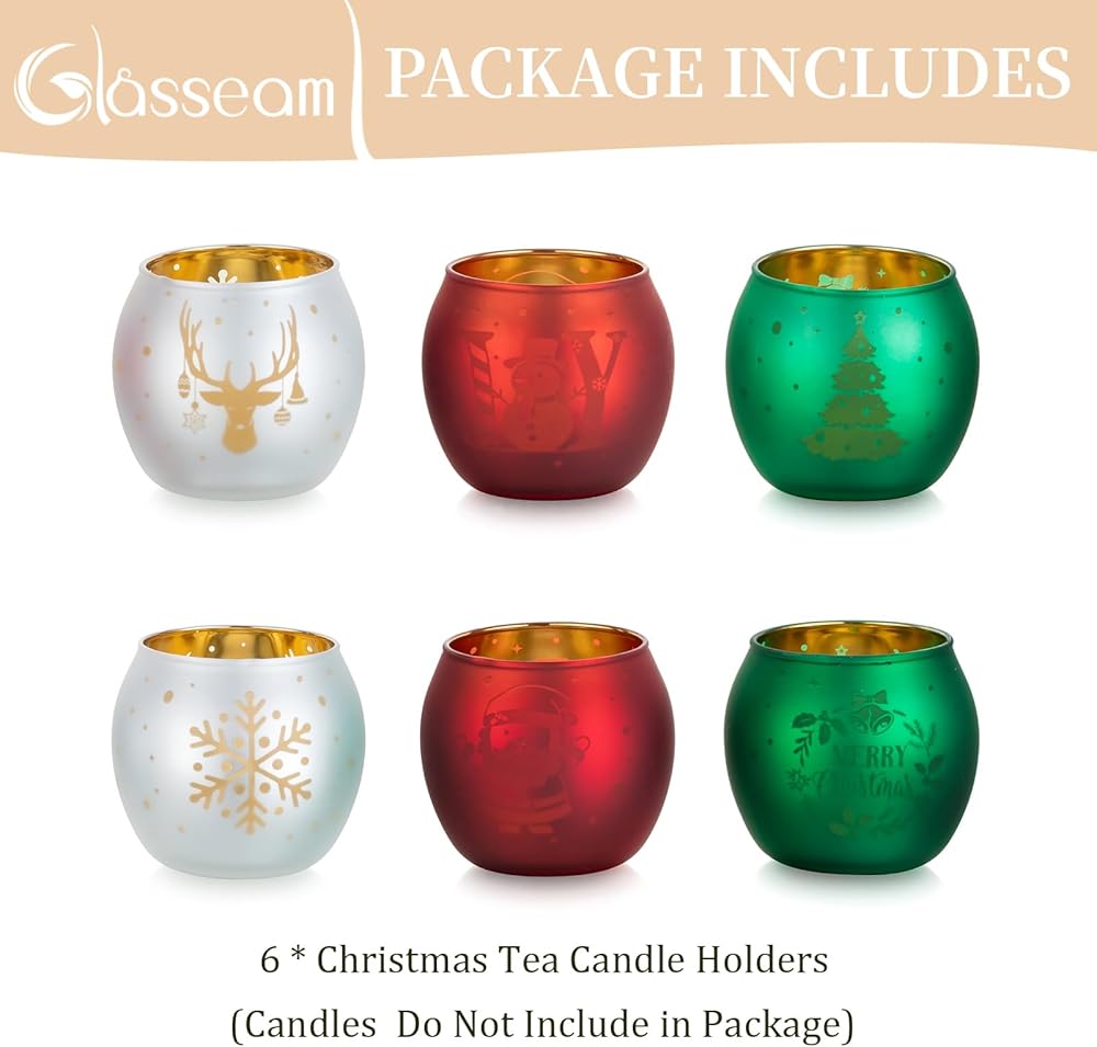 • حامل شموع عيد الميلاد: انغمس في الروح الاحتفالية مع هذه المجموعة الجميلة المكونة من 6 حاملات شموع خفيفة للشاي. تم تصميم كل حامل شموع شاي بعناية واهتمام بالتفاصيل. تم تزيين كل حامل شموع عتيق بلوحة عيد الميلاد المثالية باللون الأحمر والأخضر والأبيض، مع إبرازها بنقوش ذهبية. من أشجار عيد الميلاد وسانتا كلوز إلى رجال الثلج، ورقائق الثلج، وحيوانات الرنة، فإن كل حامل شموع من الزجاج الزئبقي هو احتفال ببهجة الموسم ودفئه.