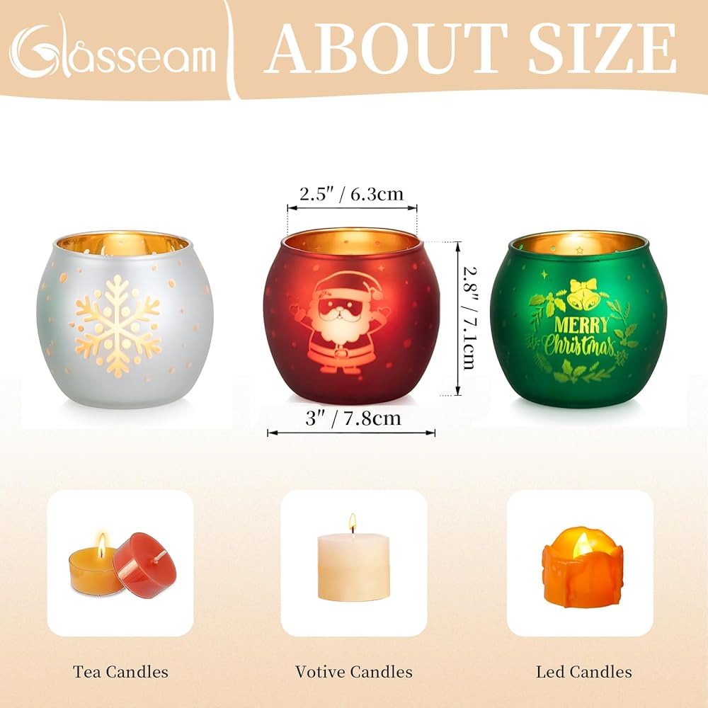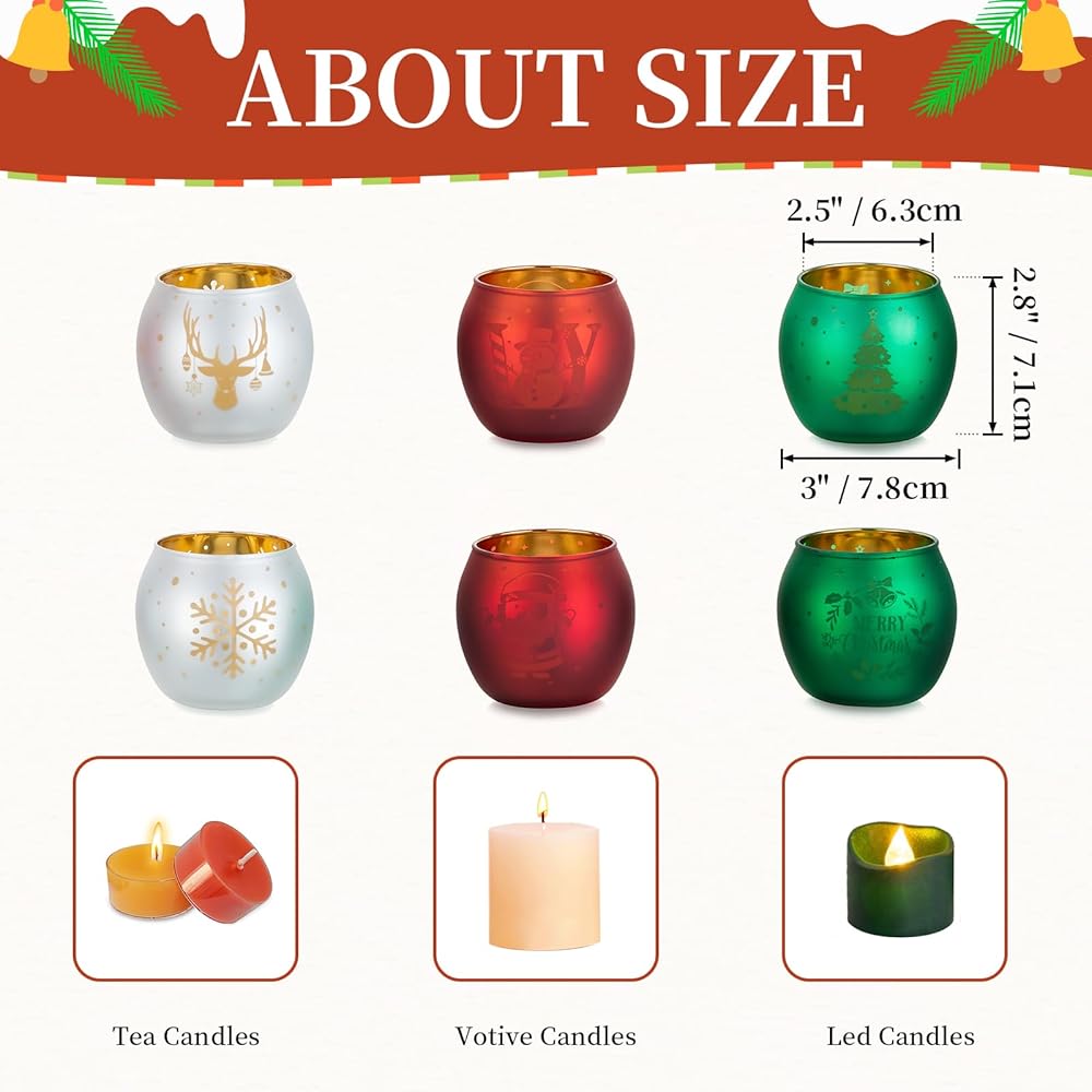 • حامل شموع زجاجي رقيق: يبلغ ارتفاع حاملات الشموع الصغيرة هذه 2.76 بوصة/ 7 سم وقطر الفتح 2.5 بوصة/ 6.3 سم ويناسب معظم الشموع، بما في ذلك الشموع النذرية، والشموع الصغيرة، وشموع LED. مصممة لتكمل أي ديكور، فهي تضيف لمسة راقية من الأناقة إلى إعداد عطلتك، وتتألق بأجواء سحر عيد الميلاد