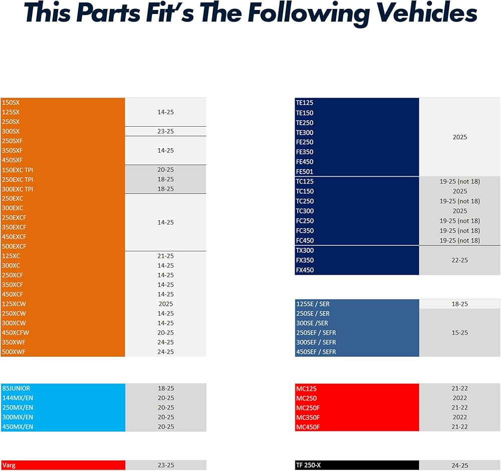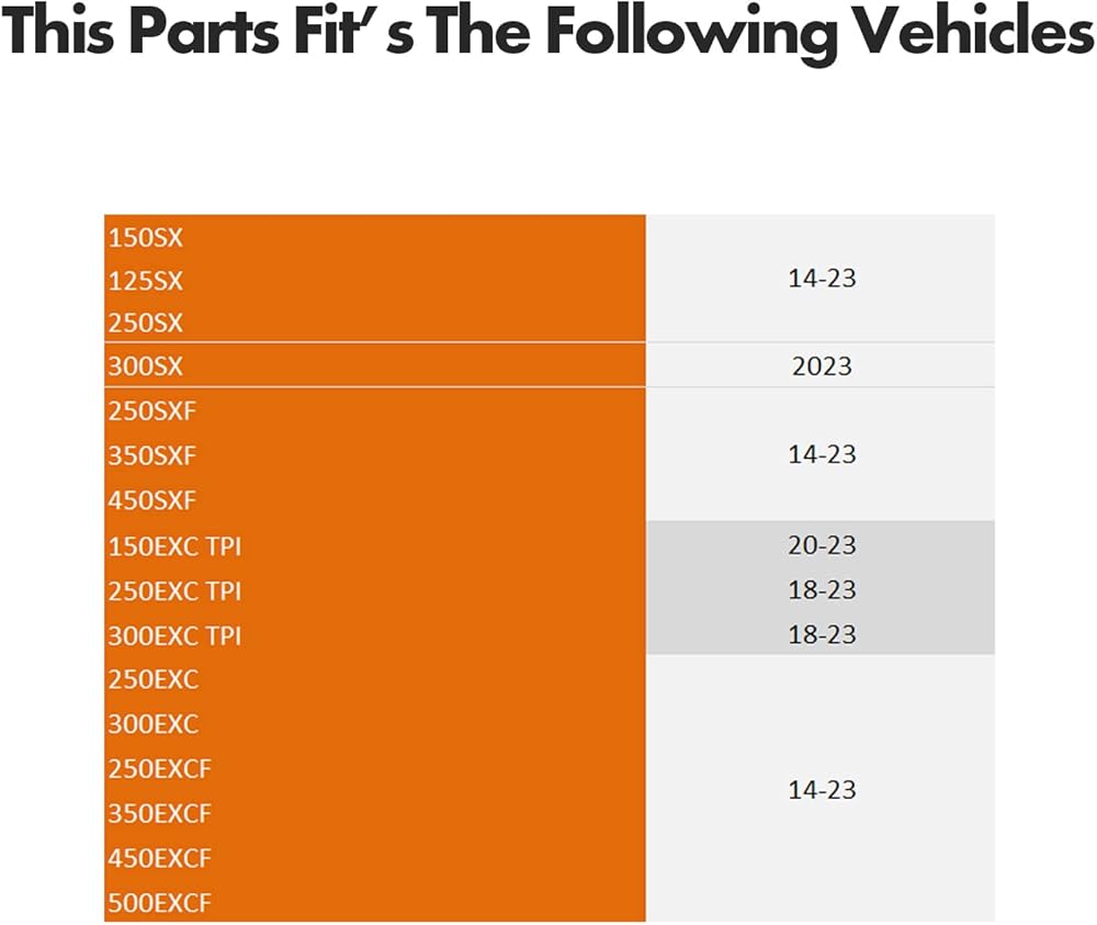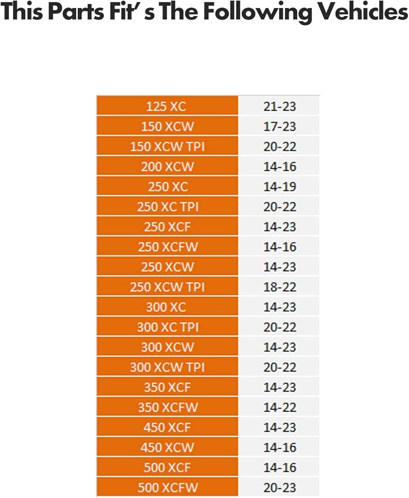 - متوافق مع KTM 150SX 125SX 250SX 250SXF 350SXF 450SXF 250EXC 300EXC 250EXCF 350EXCF 450EXCF 500EXCF 350 XCF (14-24) 300SX (23-24) 150EXC TPI 500XCFW (20-) 24) 250EXC TPI 300EXC TPI (18-43) 125XC (21-24) ) 150XCW (17-24) 150XCW TPI 250XC TPI 300XC TPI 300XCW TPI (20-22) 200XCW 250 XCFW 450XCW 500XCF (14-24) 250XC (14-19) 250XCF 250XCW 300 XC 300XCW 450XCF (14-24) 250XCW TPI (18) -24) 350 إكس سي إف دبليو (14-24) 250 إكس سي 300 إكس سي 250 إكس سي إف 350 إكس سي إف 450 إكس سي 500 إكس سي إف (14-23)