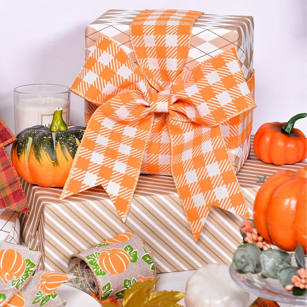 عزز ديكورات الخريف الخاصة بك مع هذا الشريط السلكي الجميل مقاس 2.5 بوصة والذي يتميز بنمط اليقطين الخيش وتصميم منقوش الجاموس.