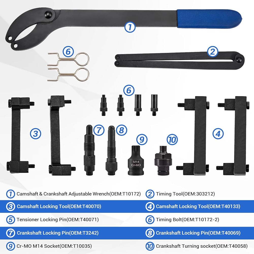 For Audi Camshaft Locking Timing Toolkit: A complete set of tools for aligning and adjusting camshafts and replacing timing chains, the toolkit comes with a comprehensive range of repair tools and a pair of gloves to wear while using the tools