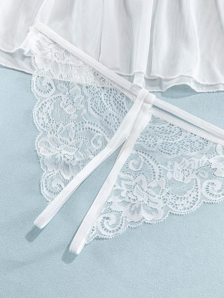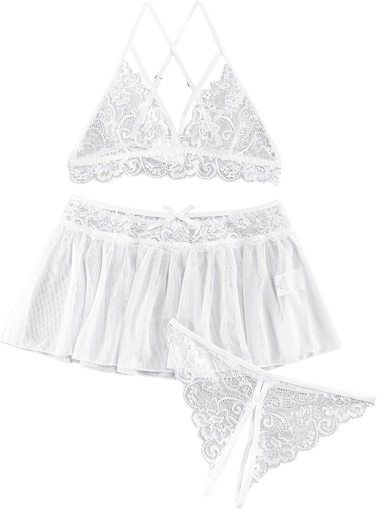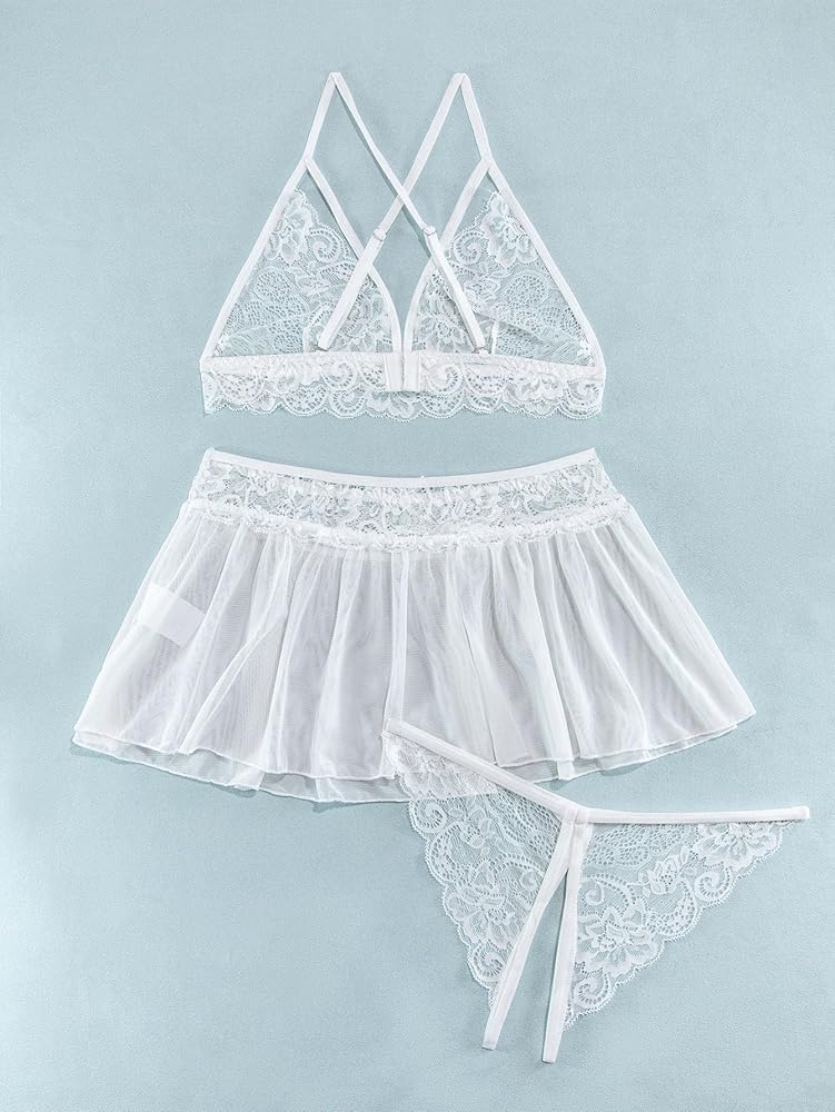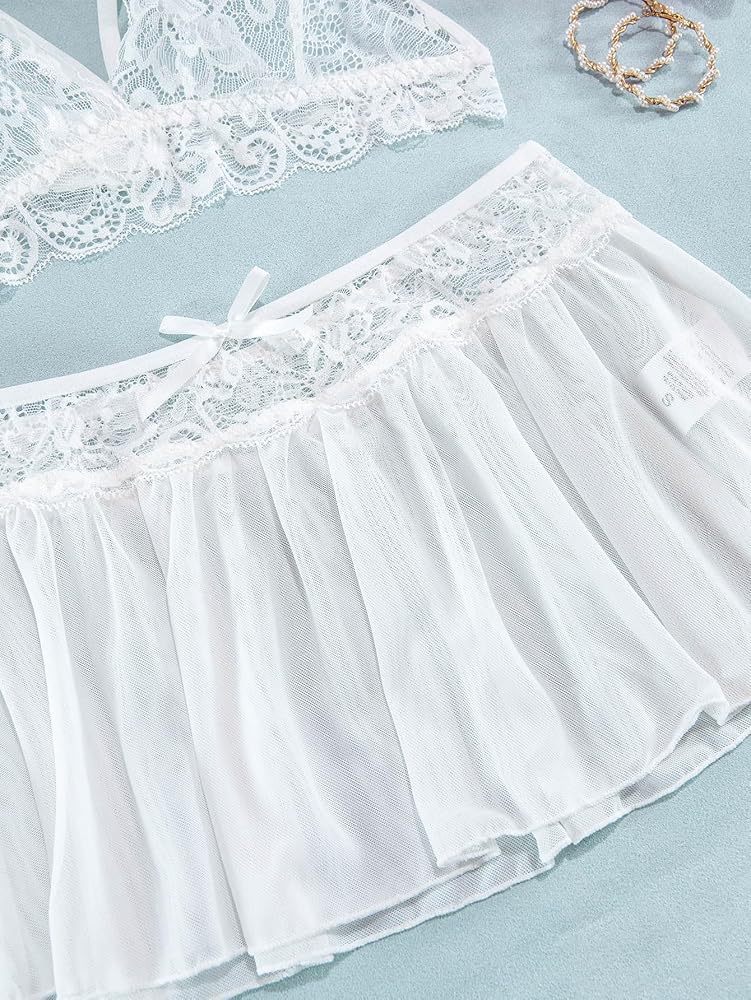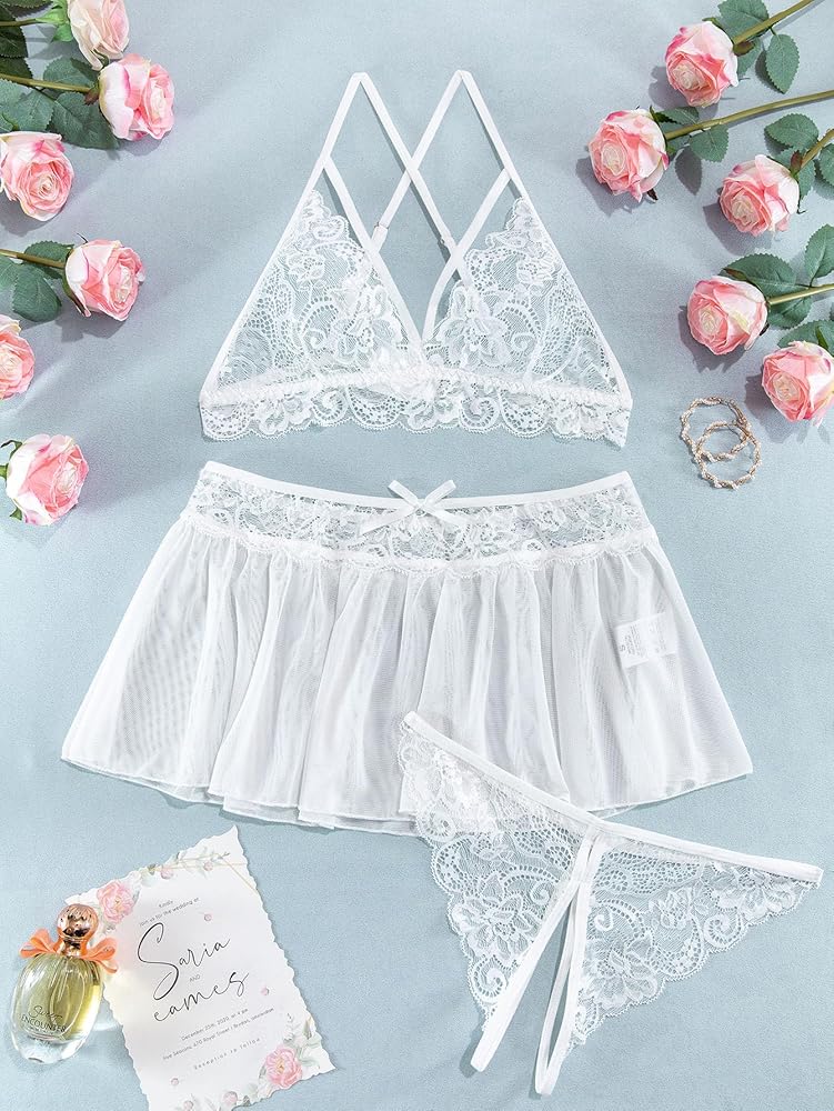 Lilosy طقم لانجري دانتيل بتنورة شبكية مثيرة مكون من 3 قطع