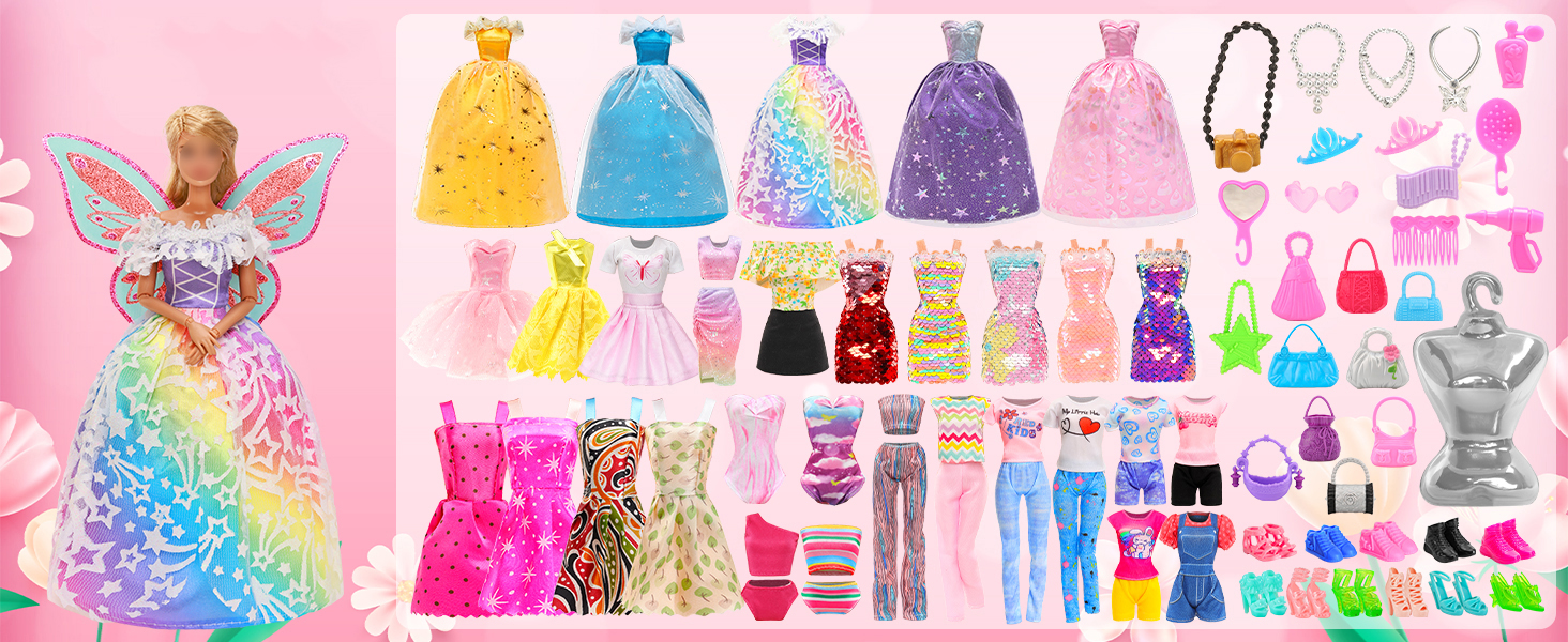 هدايا للأطفال - فساتين الدمى الأساسية وإكسسواراتها بألوان وأنماط مختلفة، كافية لتزيين دمى الأطفال، وتحفيز خيالهم، وإنشاء القصص، وعروض الأزياء، ومتعة ارتداء الملابس، ومنحها في كل عطلة.