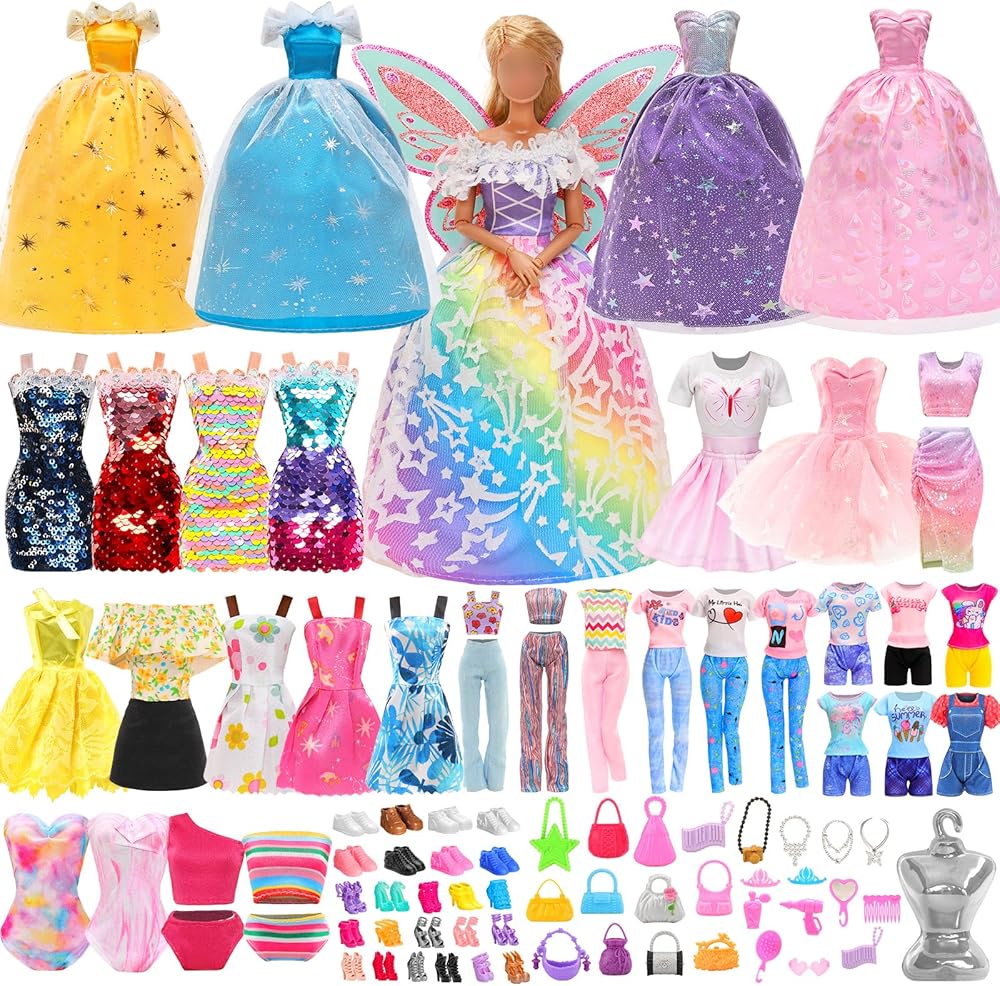 ما الذي يمكنك الحصول عليه - 110 عبوة من ملابس الدمى وإكسسواراتها= 2 فساتين يومية + 1 فستان مزين بالترتر + 2 قطعة علوية + 2 بنطلون + 2 فستان زفاف + 2 ملابس سباحة بيكيني + 10 فساتين عصرية + 30 قطعة حذاء + 5 حقائب يد + 40 شماعة + 13 إكسسوارات + 1 أجنحة لدمية فتاة مقاس 11.5 بوصة (نمط عشوائي)