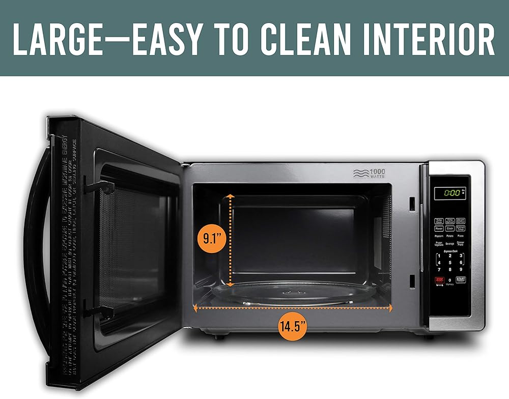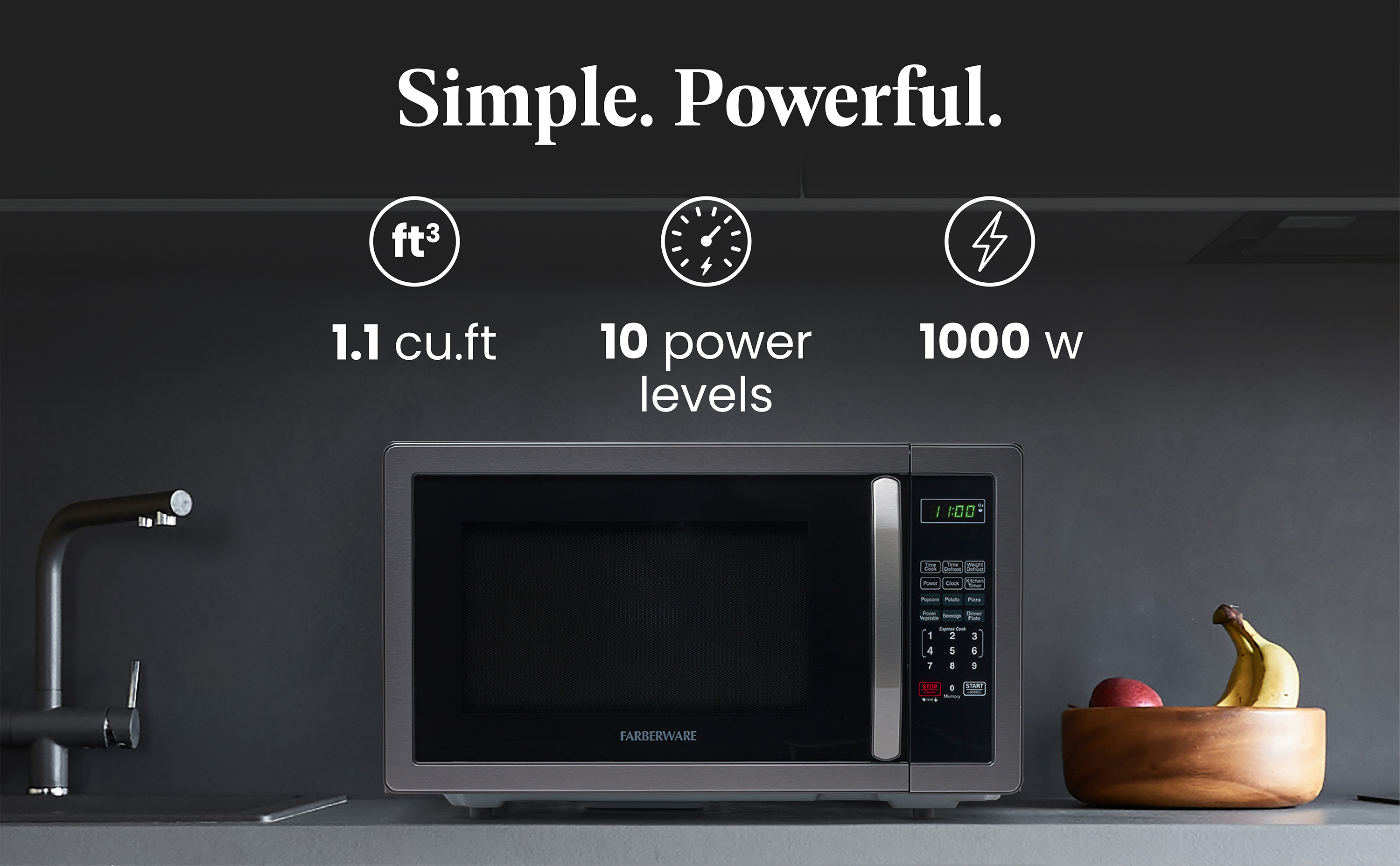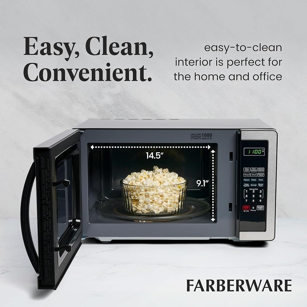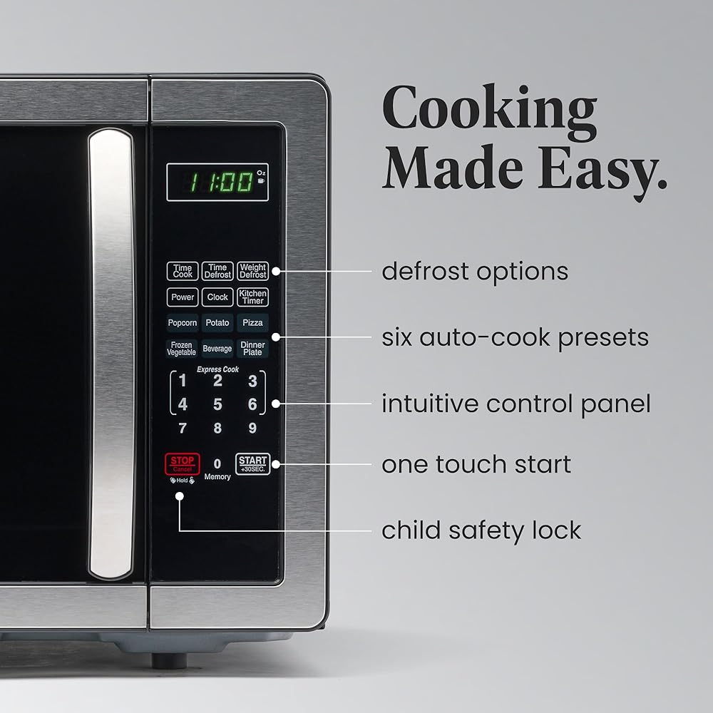 الحجم المثالي: يبلغ قياس هذا الميكروويف 1.1 قدم مكعب، وهو الحل المثالي للمساحة الصغيرة الذي يوفر طهيًا كامل الحجم في مساحة صغيرة. يتميز بتصميم داخلي وخارجي سهل التنظيف وهو مثالي للمنزل أو المكتب.