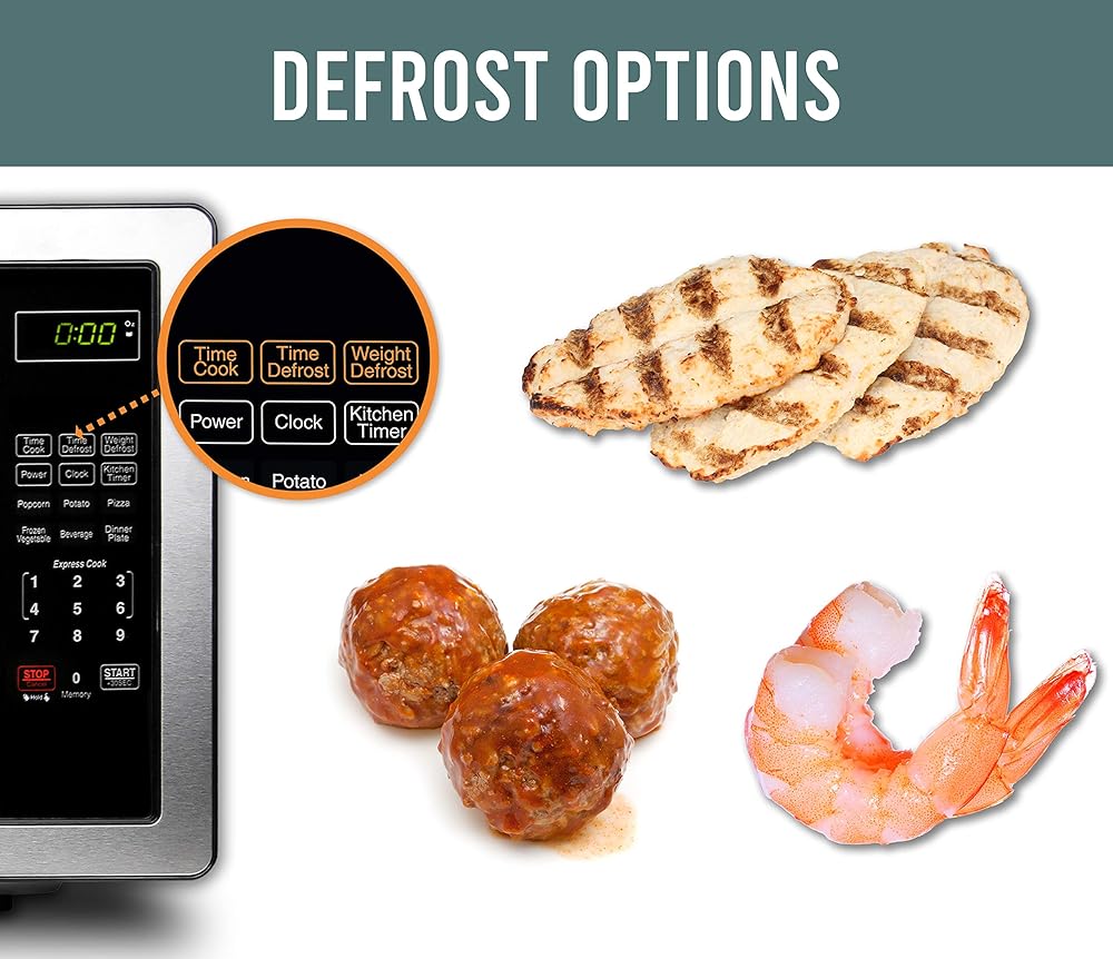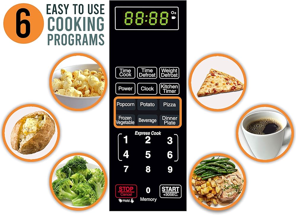 إعدادات قوية: يحتوي هذا الميكروويف على عشرة مستويات طاقة مع طهي متعدد المراحل. يمكنك تخصيص طبخك بالكامل من خلال ستة خيارات بلمسة واحدة، بما في ذلك الفشار والبطاطس والبيتزا. قم بإزالة الجليد حسب الوزن أو إعدادات الوقت لإنجاز أي مهمة بسرعة.