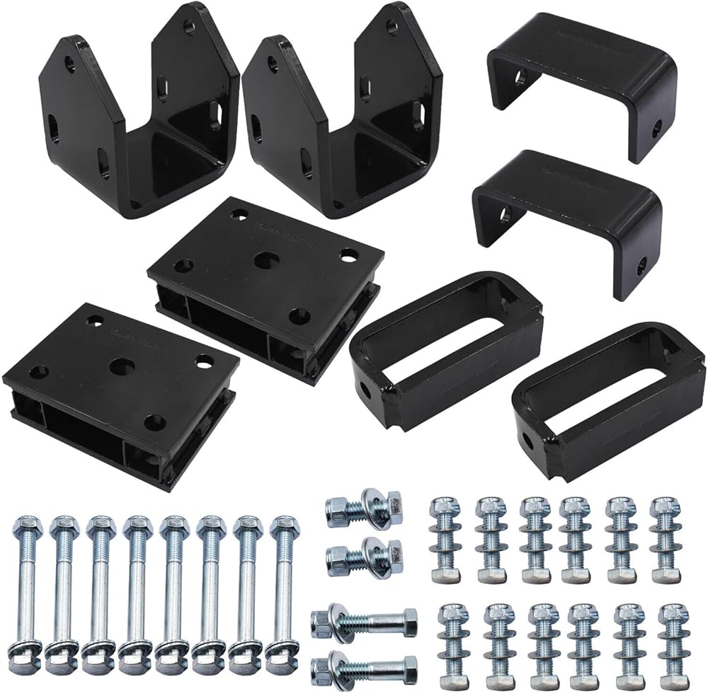 - 【Package Included】2 Pcs Tie-rod extenders ; 2 Pcs Shock extenders ; 2 Pcs Front risers ; 2 Pcs Rear risers ; Attached screws, lock nuts and washers.