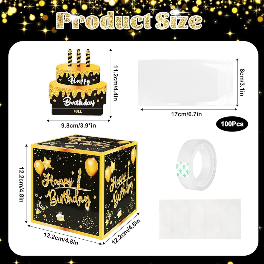 【Product Includes】This gift set includes a beautiful cardboard money box (4.8 inches), a birthday cake card (3.9 x 4.4 inches), equipped with 100 self-adhesive clear bags (6.7 x 3.1 inches, cash not included), 1 roll of clear tape, a sheet of adhesive.