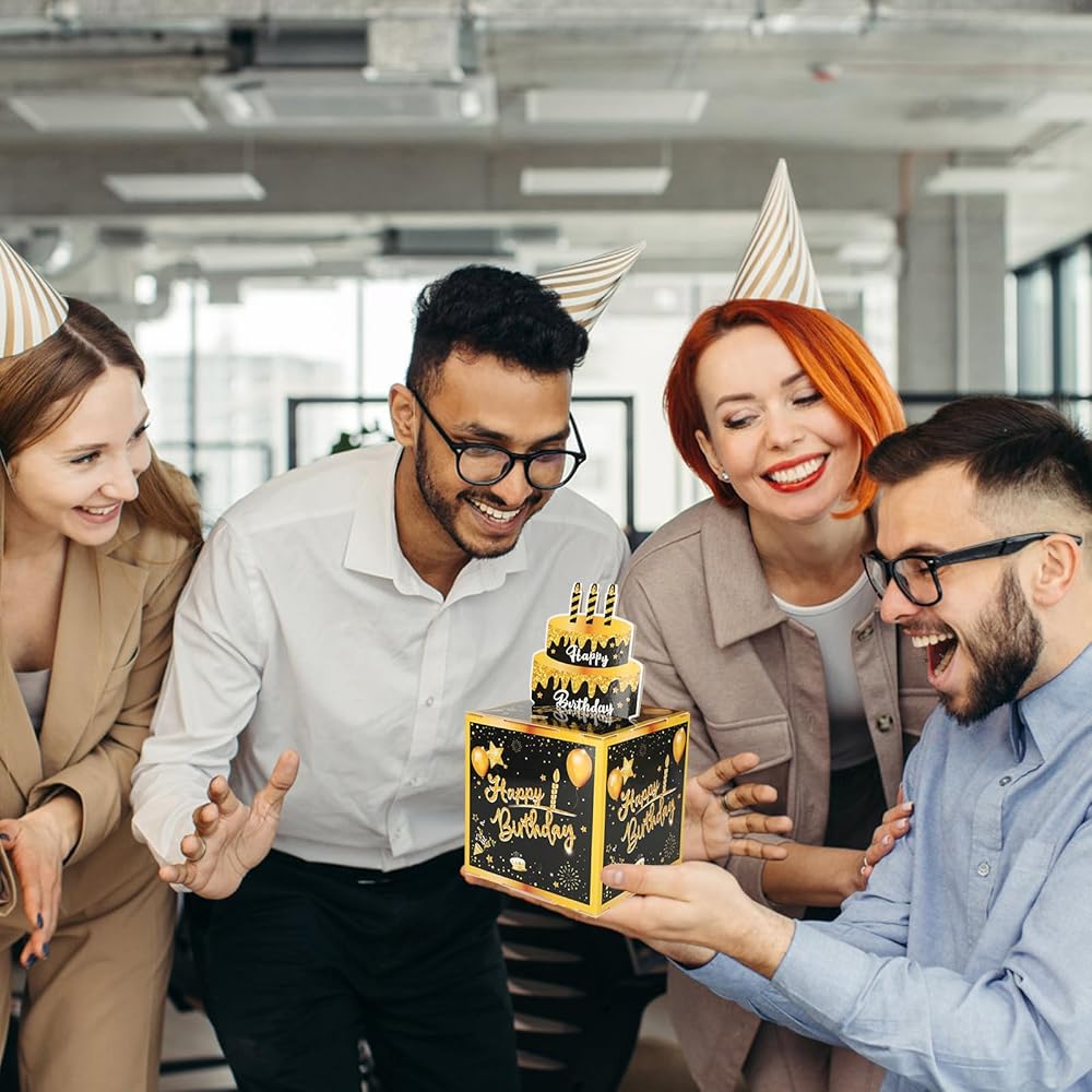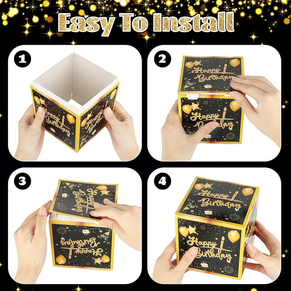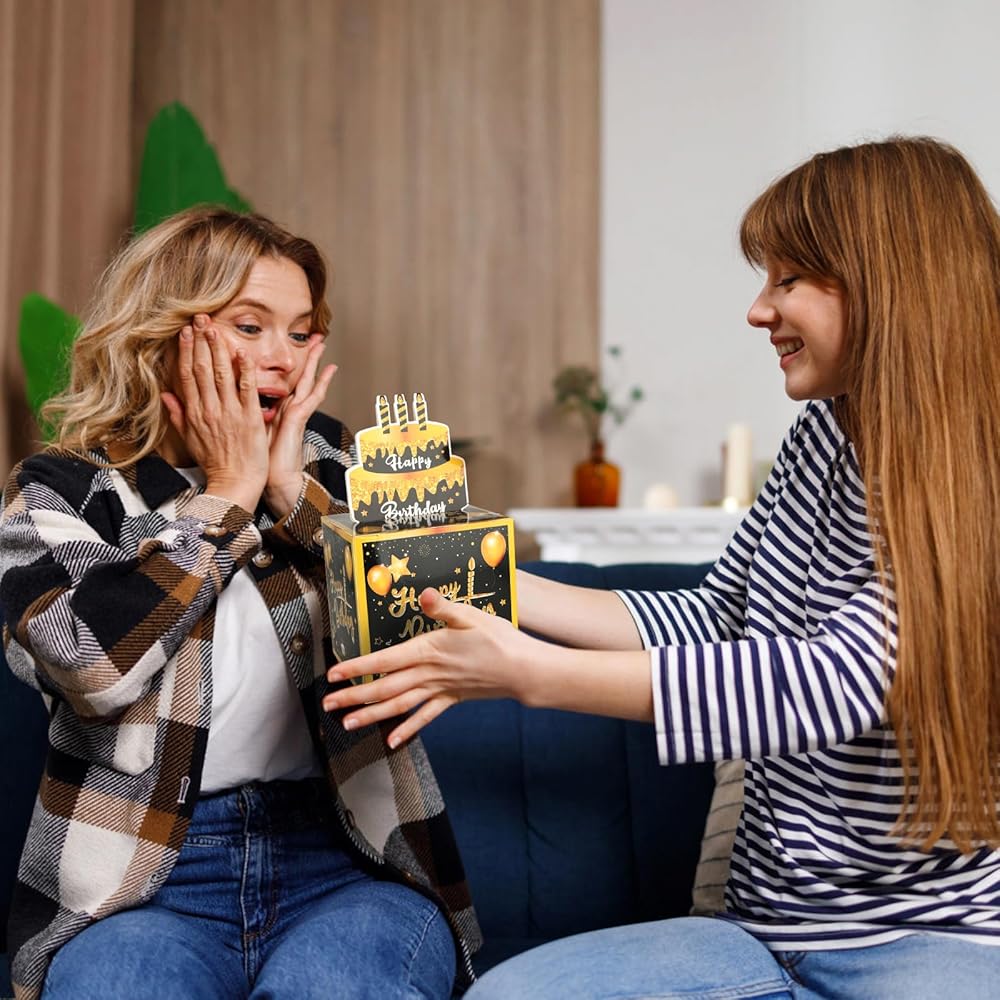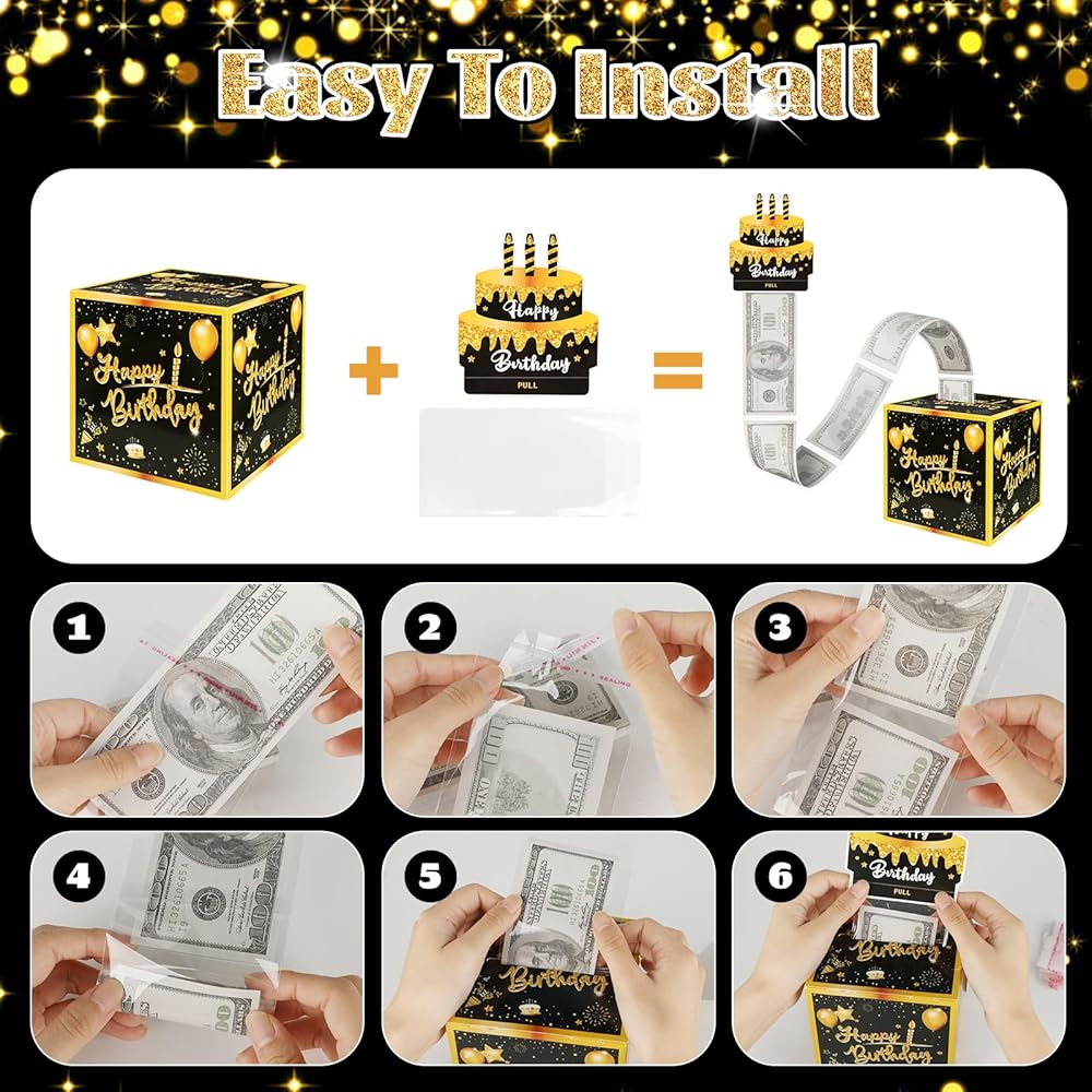 Birthday Money Box for Cash Gift Pull, Happy Birthday Money Box Explosion Gift for Kids Adults, Surprise Box Gift with Money for Men, Black and Gold Money Gift Box