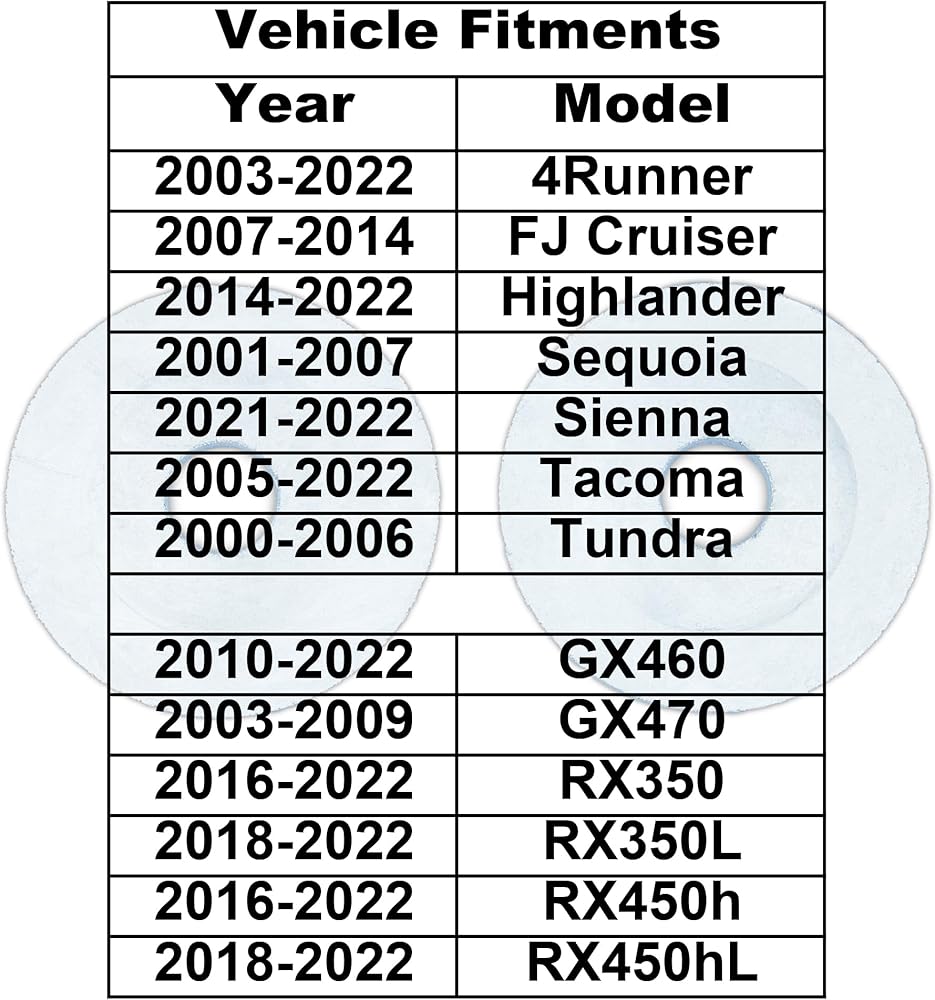 Front upper control arm bushing washers fit 2005-2022 Tacoma, 2000-2006 Tundra, 2001-2007 Sequoia, 2014-2022 Highlander, 2007-2014 FJ Cruiser, 2003-2022 4Runner, 2021-2022 Sienna.