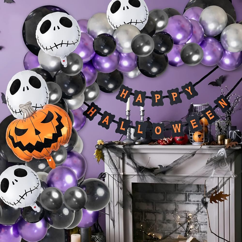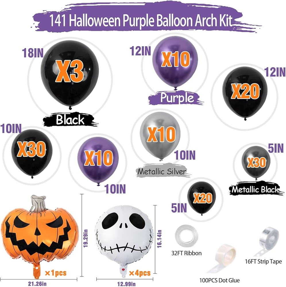 ديكورات حفلات عيد ميلاد الهالوين على شكل جمجمة - 141 قطعة من مجموعة قوس بالون أسود أرجواني مع بالونات جمجمة اليقطين لكابوس قبل عيد الميلاد، ويوم الموتى، وديكورات استحمام الطفل في الهالوين