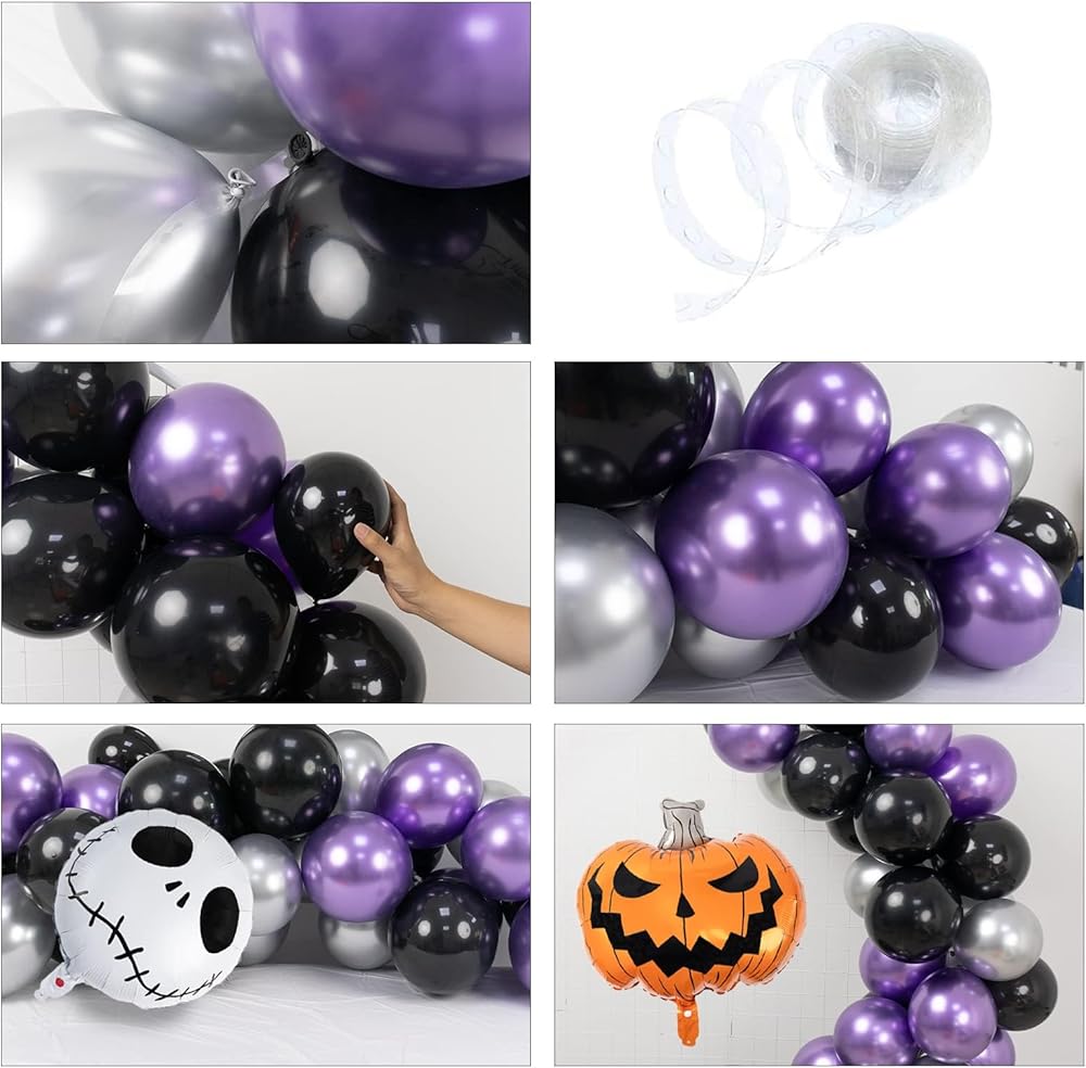عبوة قيمة: تتضمن مجموعة إكليل قوس البالونات للهالوين 133 قطعة من بالونات فضية معدنية باللون الأسود والأرجواني، و4 قطع من بالونات الجمجمة، وبالونات اليقطين العملاقة، مع شريط بالون، وشريط بالون وصمغ منقط. مجموعة تزيين رائعة لحفلات الهالوين.