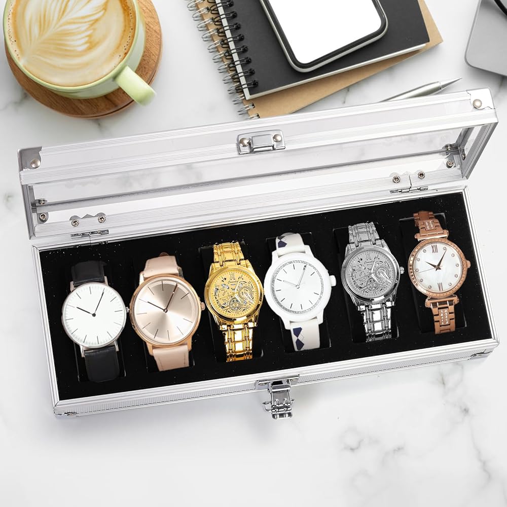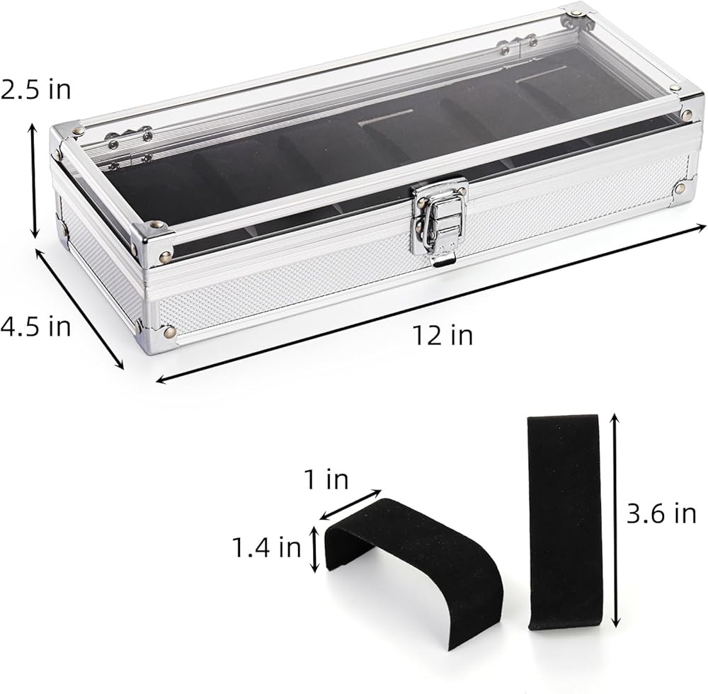 6-فتحة: يمكن لمنظم الساعات لدينا تخزين 6 ساعات ويناسب أنواع مختلفة من الساعات بحجم قرص يصل إلى 30 ملم. أبعاد الصندوق: 12 بوصة طول × 4.5 بوصة ارتفاع × 2.5 بوصة ارتفاع.