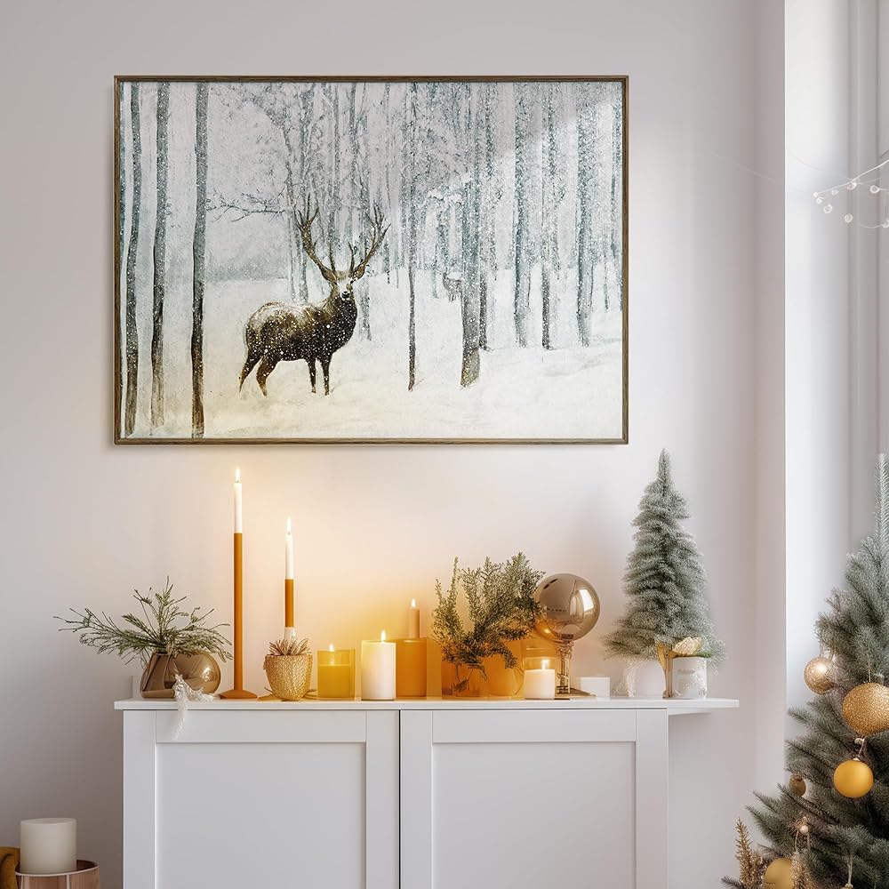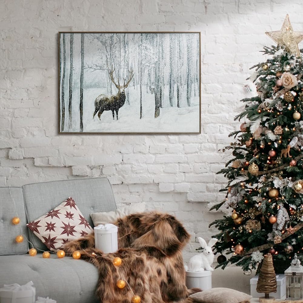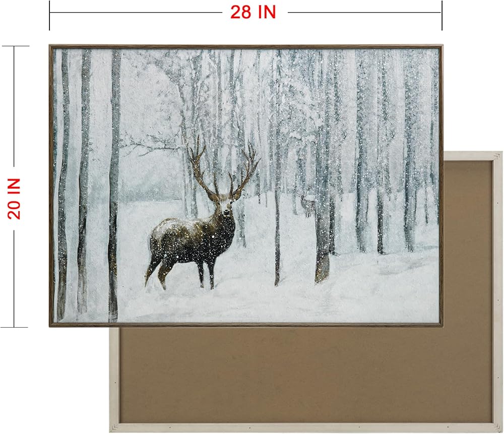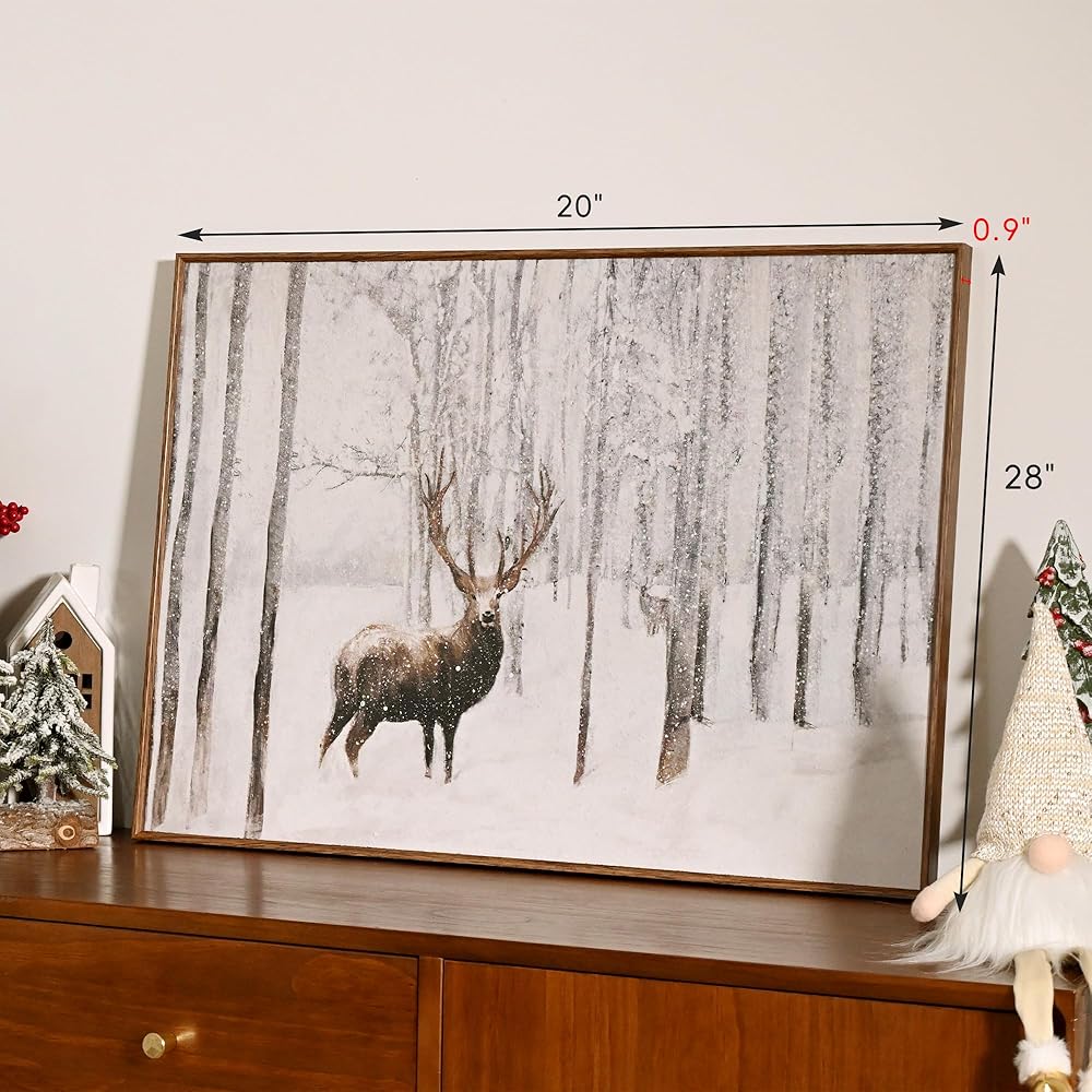 ArtbyHannah 20x28 بوصة عيد الميلاد قماش جدار الفن، مؤطرة ديكور جدار عيد الميلاد، جدار الفن الشتوي مع الغزلان في الغابة الثلجية، ديكور عيد الميلاد الرنة لتزيين جدار عيد الميلاد