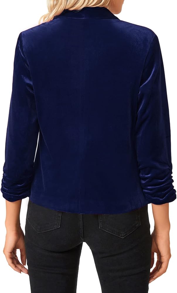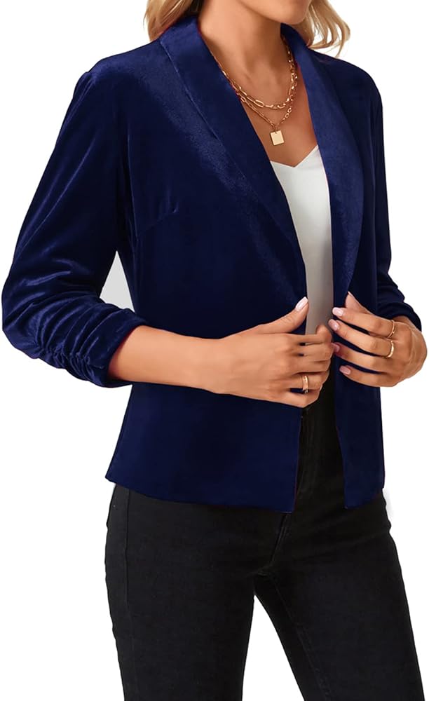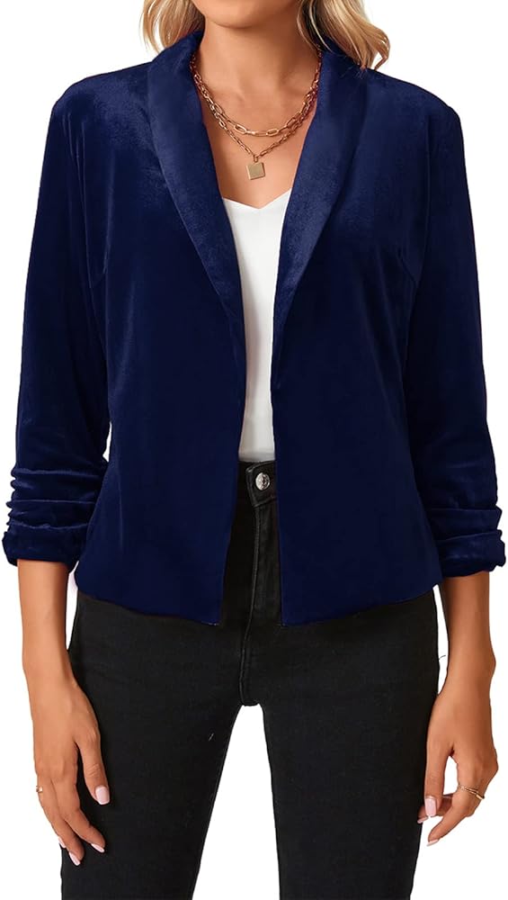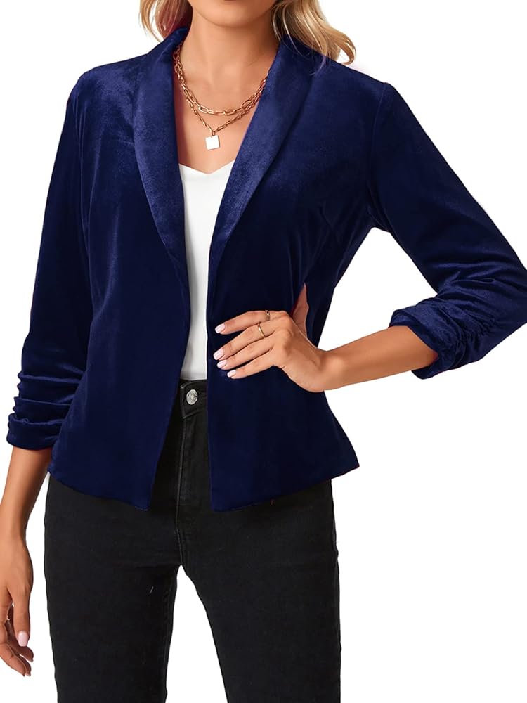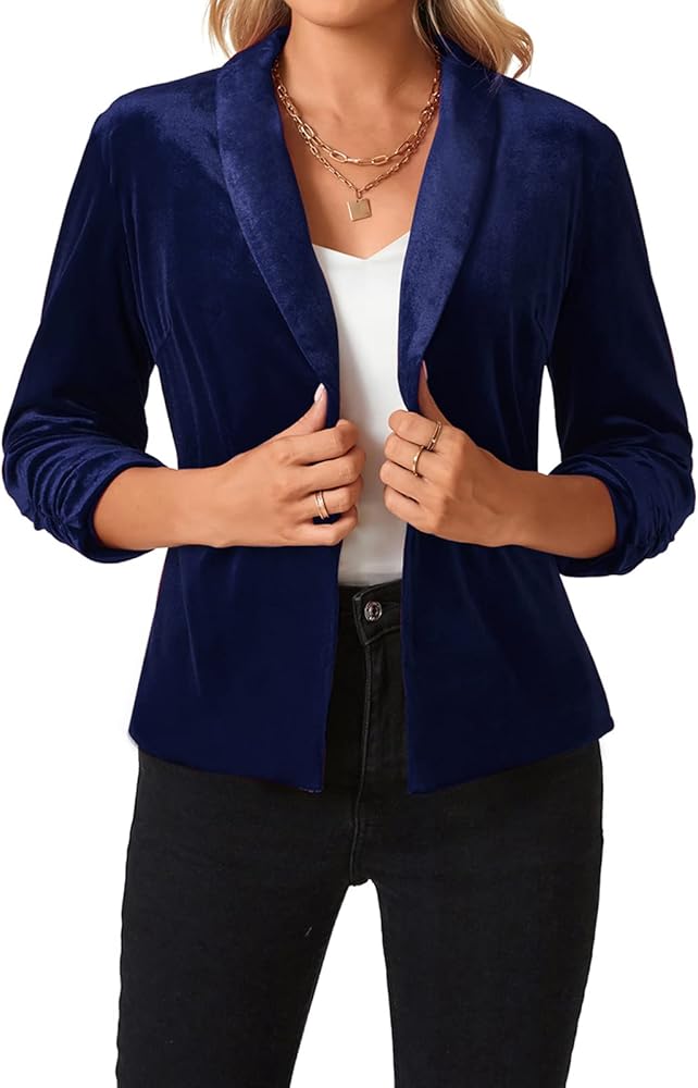 السمات: سترة يومية كاجوال مفتوحة من الأمام تتميز ببطانة كاملة، وأكمام مكشكشة 3/4، وطية صدر شال، مصنوعة من نسيج مخملي عالي الجودة ناعم ومسامي. هذه السترة أقل تنظيمًا من السترة التقليدية وهي مثالية لمظهر العمل غير الرسمي.