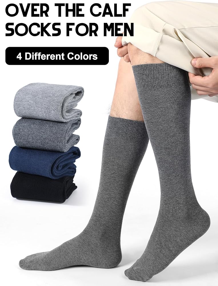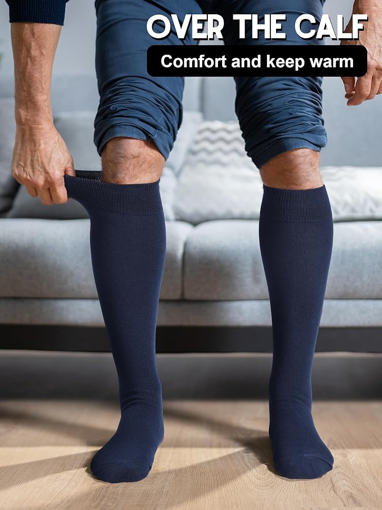 Ideal Fit: our over the calf dress socks are designed to reach up to the knee for comprehensive coverage and warmth, and are ideal for colder seasons; They have been designed with an ideal 'one size fits most' fit; They comfortably accommodate shoe sizes from 7-12, maintaining a snug fit and ensuring they stay up long time without slipping down