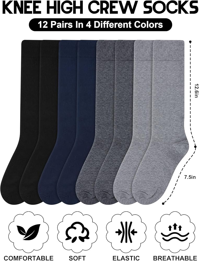 Bulk Pack Quantity: each package comes with 12 pairs of knee high socks for men in 4 colors, each color has 3 pieces; With this bulk pack in your wardrobe, you can have a fresh pair of over the calf socks for almost a week's worth of dress occasions or for switching out between laundry days