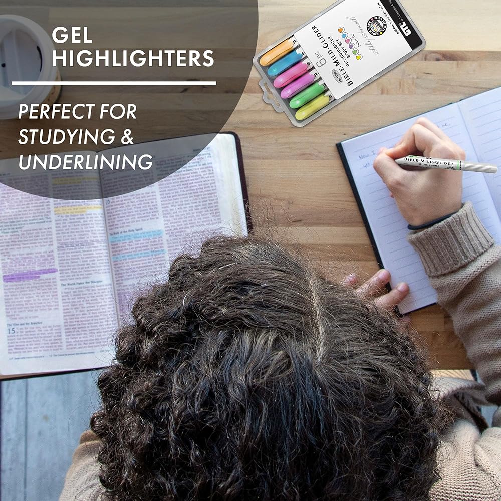 مجموعة ألوان متنوعة تشمل الأصفر الباستيل والأخضر والوردي والأرجواني والبرتقالي الخوخي. هايلايتر جل آمن على الكتاب المقدس، يلفت الأنظار بصبغة خفيفة اللون. مساعدة كبيرة في تعلم وحفظ الكتاب المقدس وإيجاد رسائل ذات معنى أثناء دراسة الكلمة.