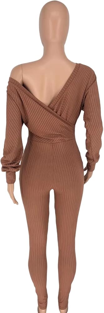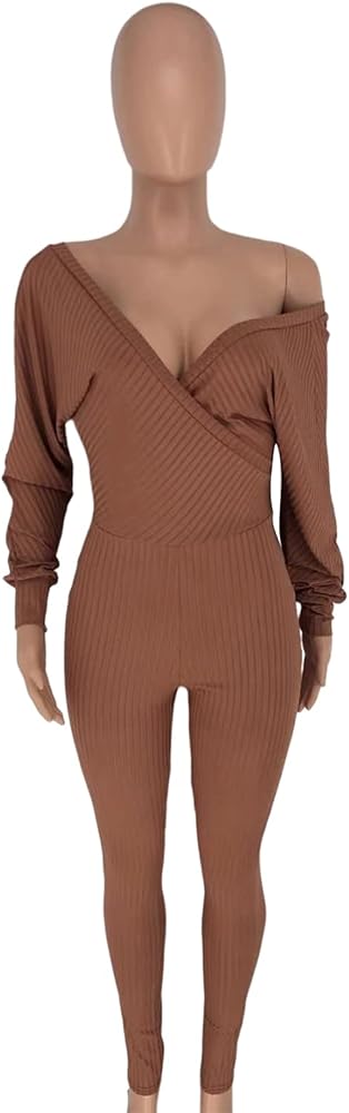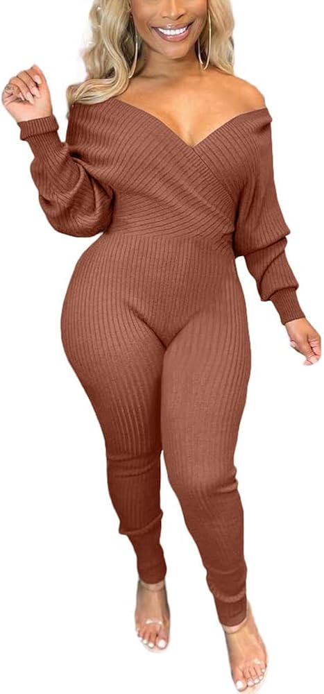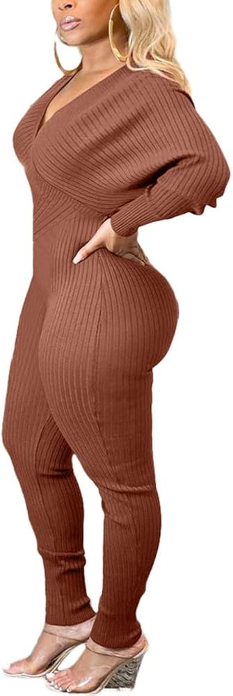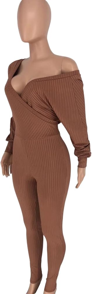 - بذلة Bodycon للنساء، بذلة مثيرة بأكمام طويلة، لون ثابت، نسيج مضلع، رقبة عميقة على شكل حرف V، مقاس نحيف، حزام، قطعة واحدة من السراويل الطويلة