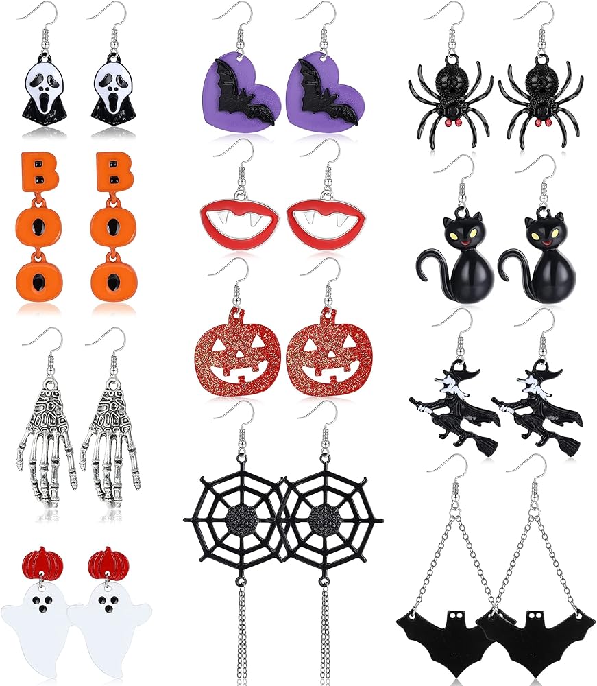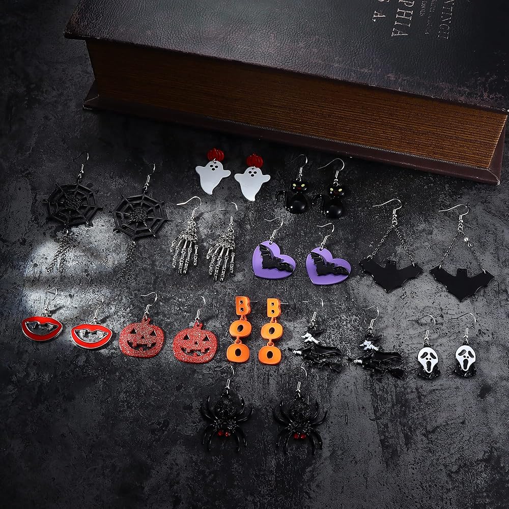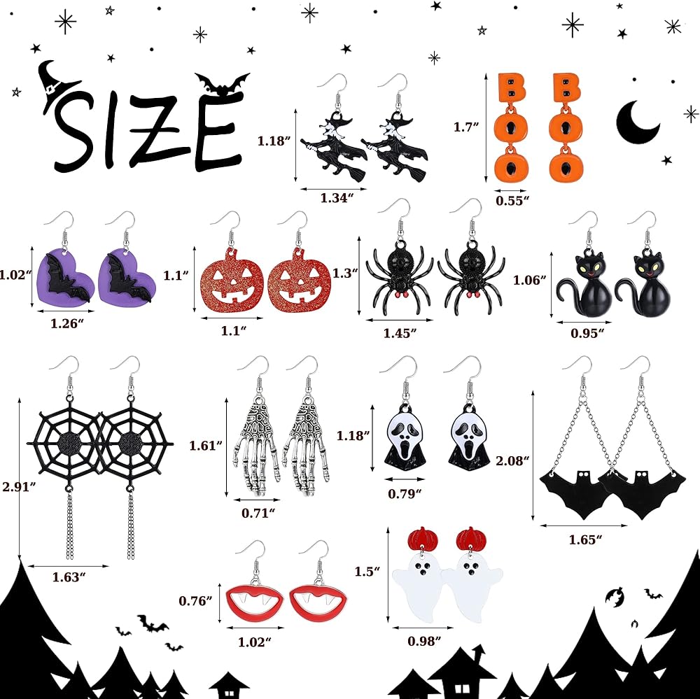 🎃مجموعة أقراط الهالوين🎃 12 زوجًا من أقراط الهالوين المخيفة واللطيفة مجموعة واحدة. تشمل أقراط اليقطين للهالوين، وأقراط الساحرة، وأقراط القطة السوداء، وأقراط الهيكل العظمي المخيف وأقراط العنكبوت، وأقراط الشبح اللطيفة وأقراط بوو وما إلى ذلك. أقراط أذن أزياء الهالوين من بيكفيكت لتلبية الذوق الاحتفالي وجعل الحفلة أكثر إثارة ومتعة.