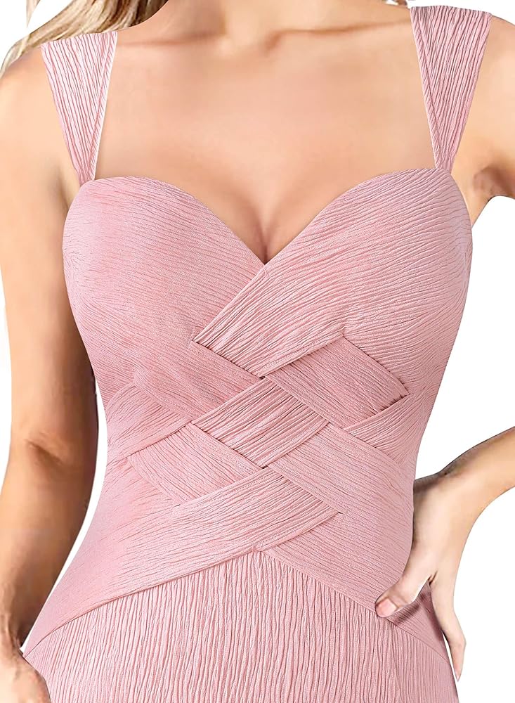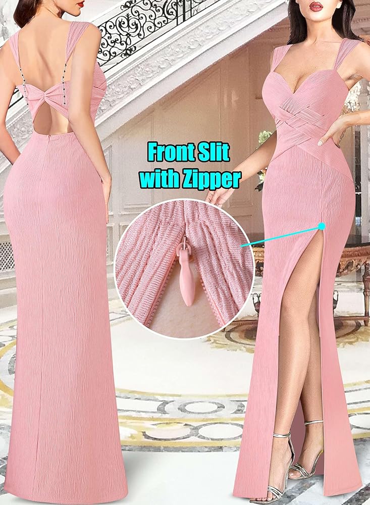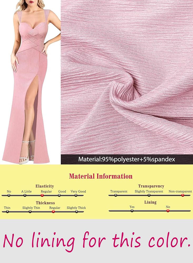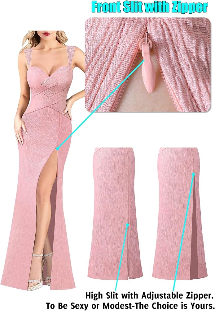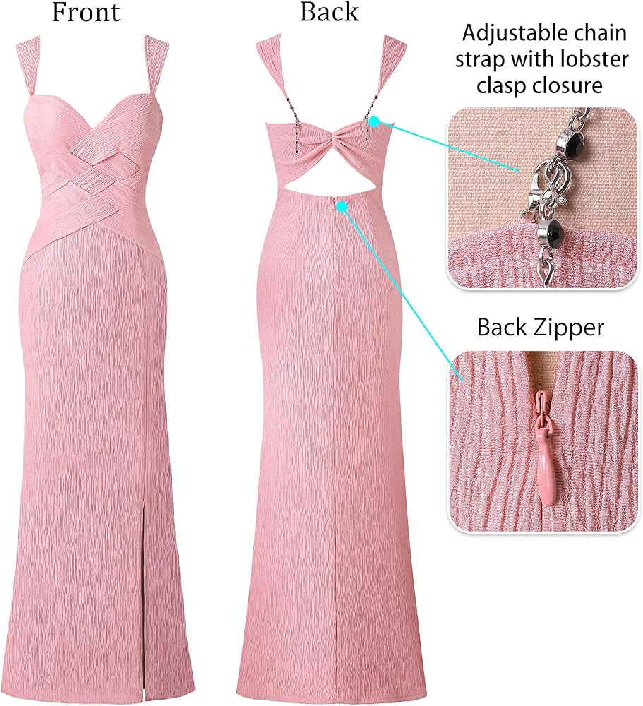 النمط: رقبة على شكل حرف V، حزام عريض مع سلسلة مطرزة بالكريستال قابلة للتعديل في الخلف، تصميم فريد من نوعه من نسيج السلة، فتحة خلفية مفتوحة بكشكشة، مقاس نحيف، طول طويل، فتحة عالية بسحاب قابل للتعديل [السحاب القابل للتعديل يسمح لك بسحاب أو فك السحاب الشق حتى تتمكن من تحديد مقدار الساق التي تريد إظهارها]، سحاب خلفي مخفي.