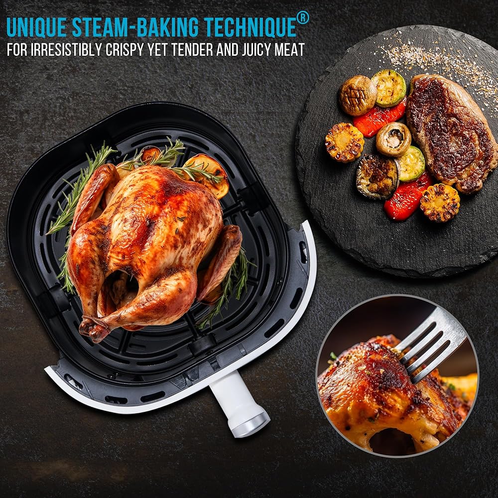 • [استمتع بوجبات سريعة وصحية]: فرن المقلاة الهوائية هذا مع تقنية الخبز بالبخار الفريدة ودوران الهواء الساخن ستيريو 4D - احصل على لمسة نهائية ذهبية مثالية ومقرمشة وطرية ونتائج زيت أقل بنسبة تصل إلى 85% في كل مرة!