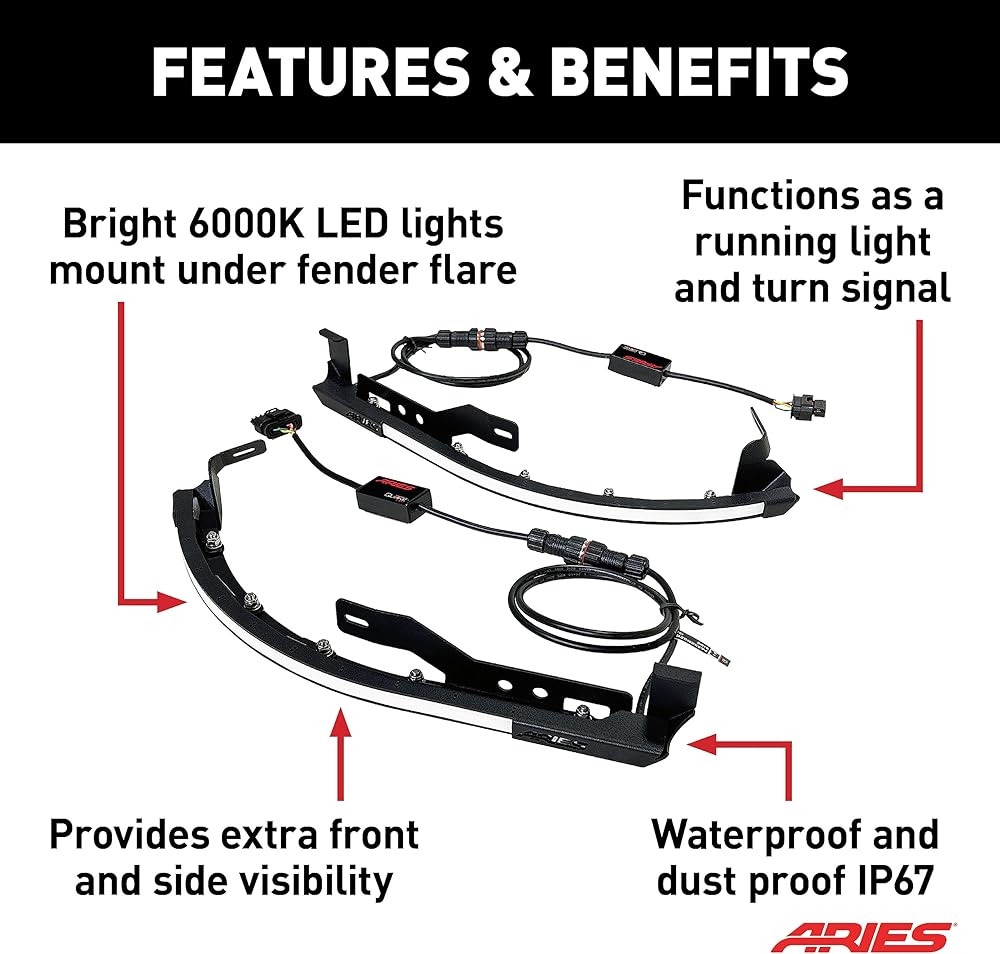BOLD STYLE - The bright, ultra-white 6000K LED lights are designed to function as running lights and turn signals while also highlighting your ARIES fender flares and body lines, giving your rig an aggressive and bold stance that turns heads