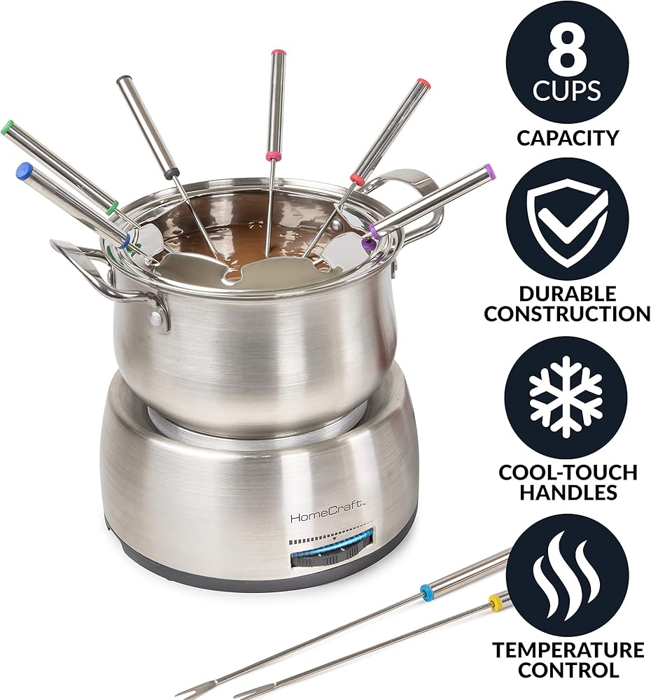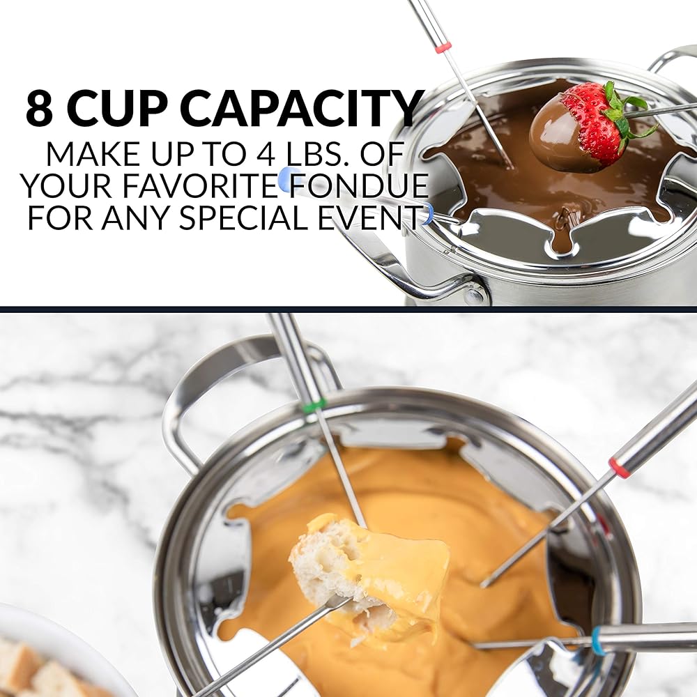 ALL-INCLUSIVE SET: This set has everything you need for a successful fondue night, including 8 color-coded fondue forks, a support ring, and a 2-quart electric fondue pot.