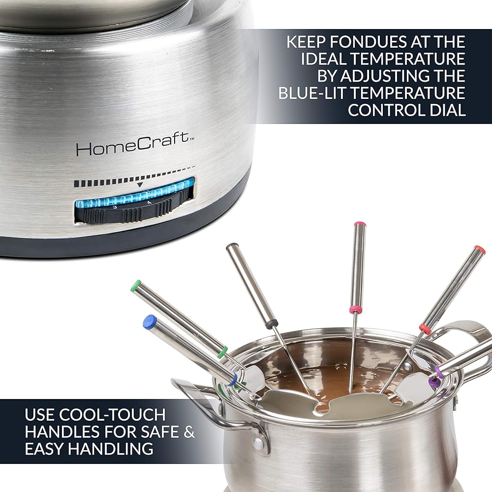 SAFE AND CONVENIENT: Keep fondues at the ideal temperature by adjusting the blue-lit temperature control dial. Use the cool-touch side handles for safe and easy handling while moving the removable pot.
