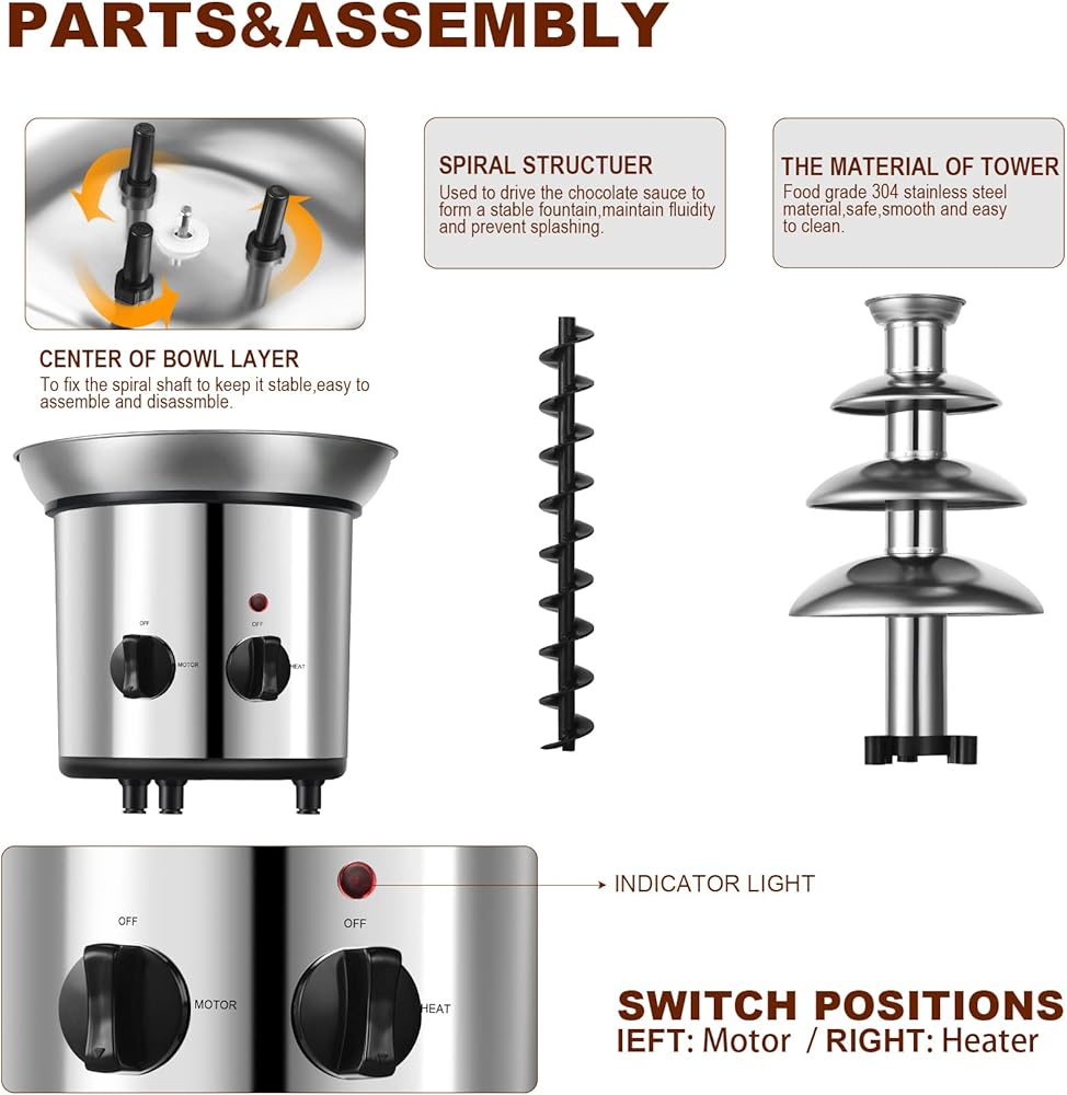 • 【نافورة حلزونية】تخلق النافورة الحلزونية تأثيرًا متتاليًا جميلاً مع هيكل حلزوني لمنع التناثر، كما أن طبقات البرج الأربعة متباعدة بشكل صحيح لتسهيل الصلصة والغمس.
