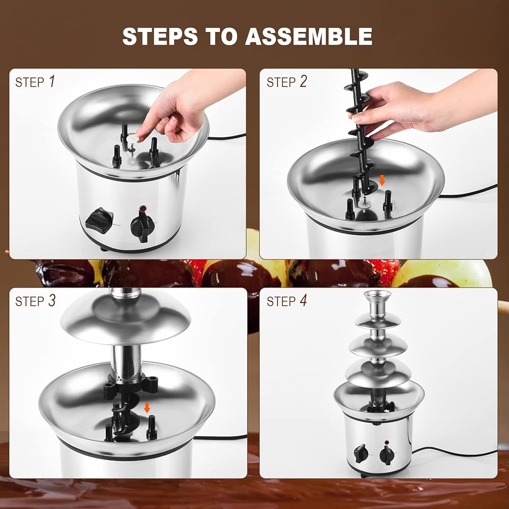 نافورة الشوكولاتة، آلة صهر كهربائية مكونة من 4 طبقات، مجموعة نافورة فوندو الشوكولاتة مع 6 قطع شوك من الفولاذ المقاوم للصدأ، سعة 4 رطل، وعاء للتحكم في محرك الحرارة المتتالي من الفولاذ المقاوم للصدأ لجبن الناتشو، صلصة الشواء، المزرعة