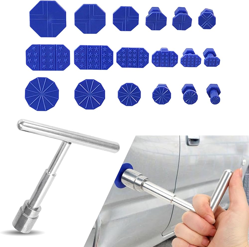 Ajxn 19 PCS Car Body Dent Repair Kit, T-type Puller + 18 Sticky Pieces Non-destructive Car Paint Repair Tool, Reusable Repair Accessories for Hail Damage Impact, Universal for Cars (Blue & Silver)