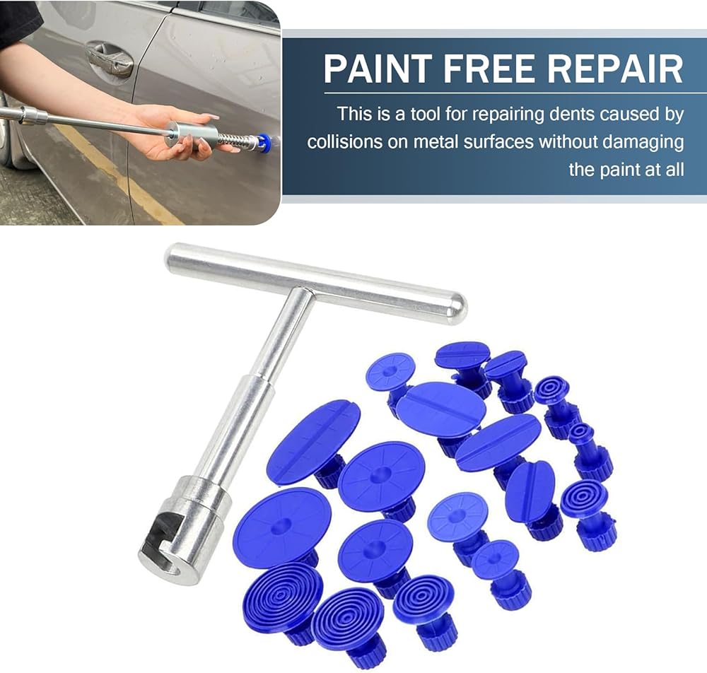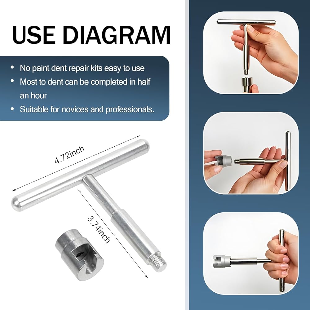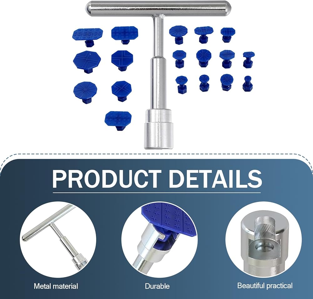 • Packing List: The package includes 18 washers of different specifications and 1 T-type puller. The larger the gasket, the greater the pulling force. It is suitable for most cars, trucks, off-road vehicles, etc, and is used for daily minor impact dents, hail damage, etc. Note that for more serious dents, more complex repairs may be required.
