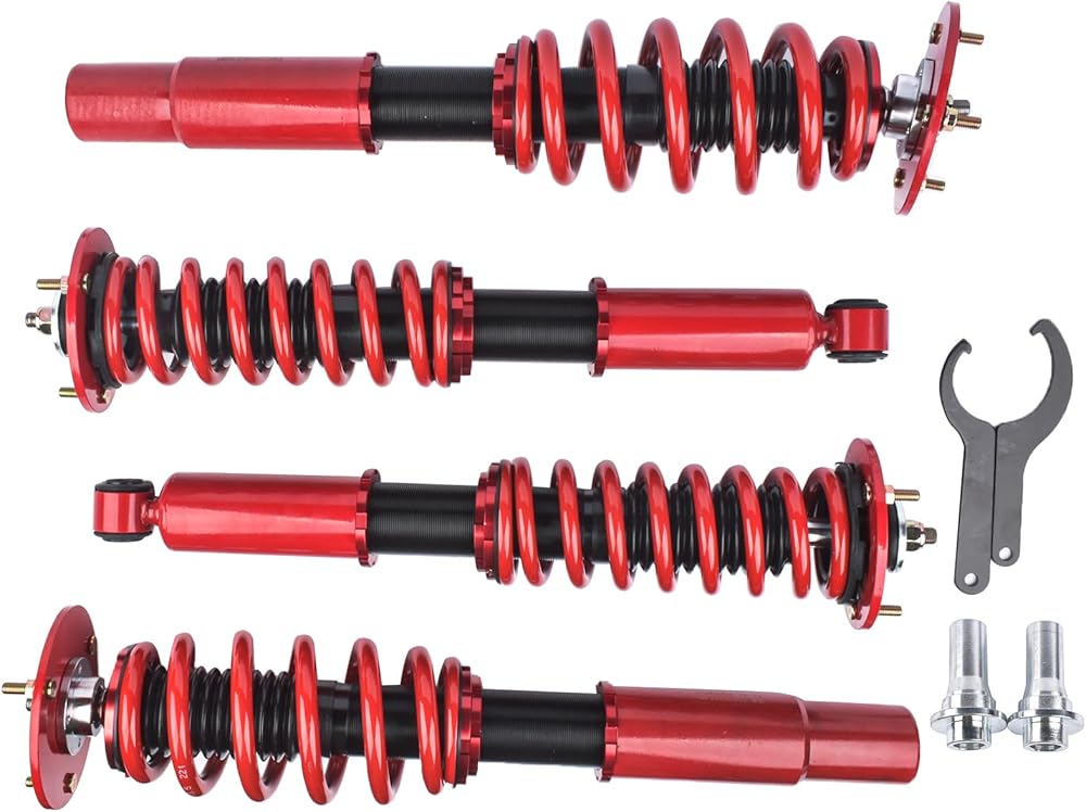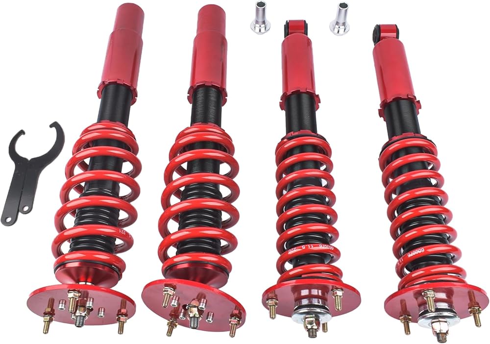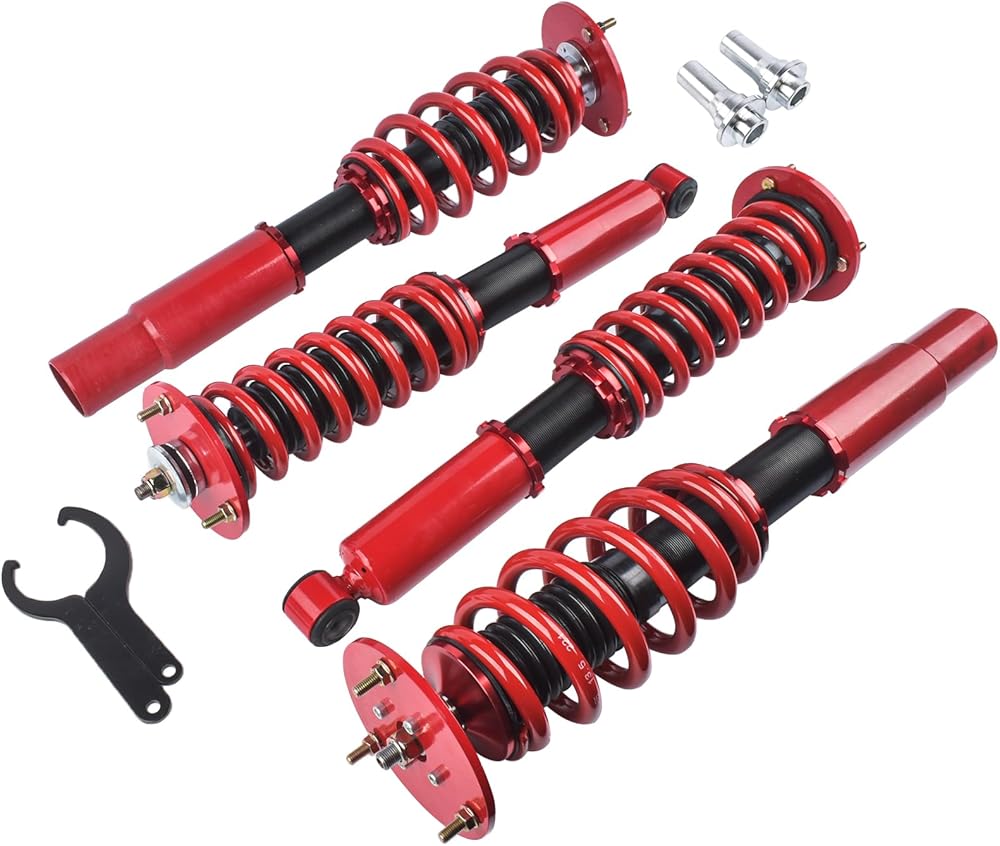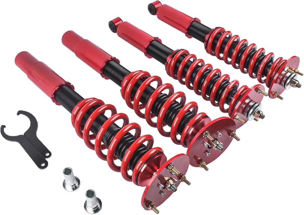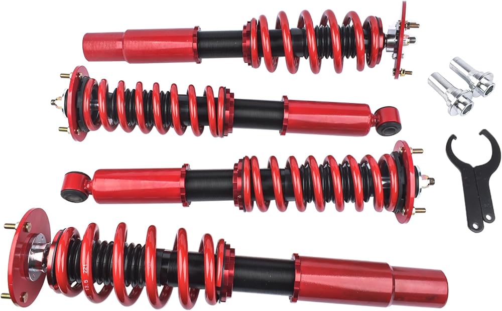 🔧【Features】: Coated to avoid rusting; Heavy duty steel lower bracket; Simple installation and easy adjustment; Full length height adjustable -Lower your car 1-3 inches for a great ride; Independent body height and spring preload adjustments; Dual tube system for a comfortable ride on the street.