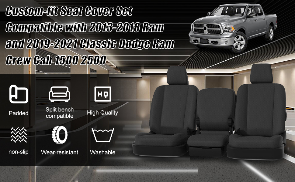 الملاءمة: استبدال مجموعة غطاء المقعد لـ 2013-2018 Ram و2019-2021 Classic Dodge Ram Crew Cab الأمامي والخلفي. (إذا لم تكن متأكدًا مما إذا كان مناسبًا لسيارتك، فلا تتردد في الاتصال بنا، وفريقنا المحترف سوف تساعدك على تأكيد)