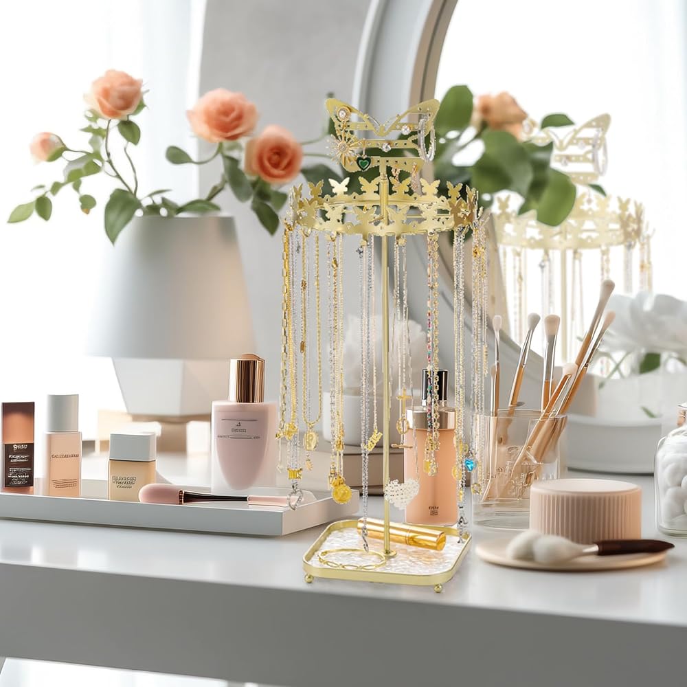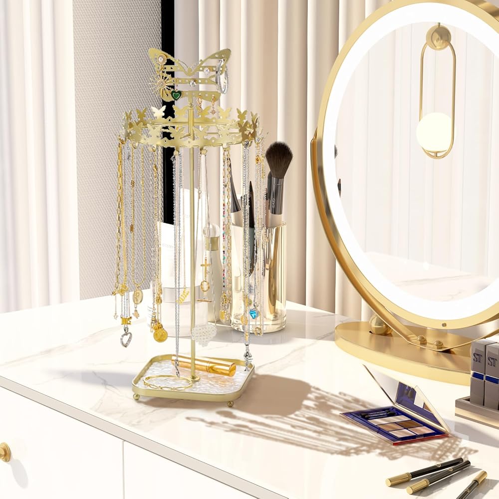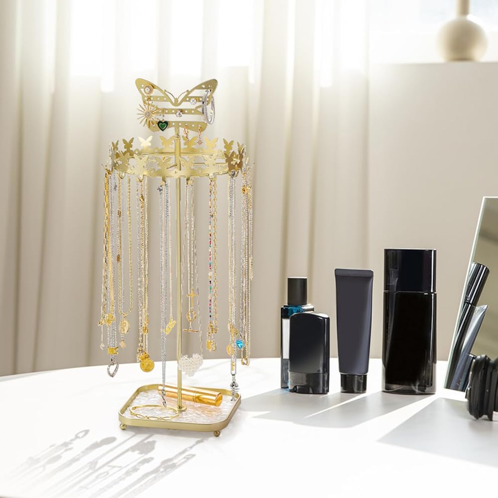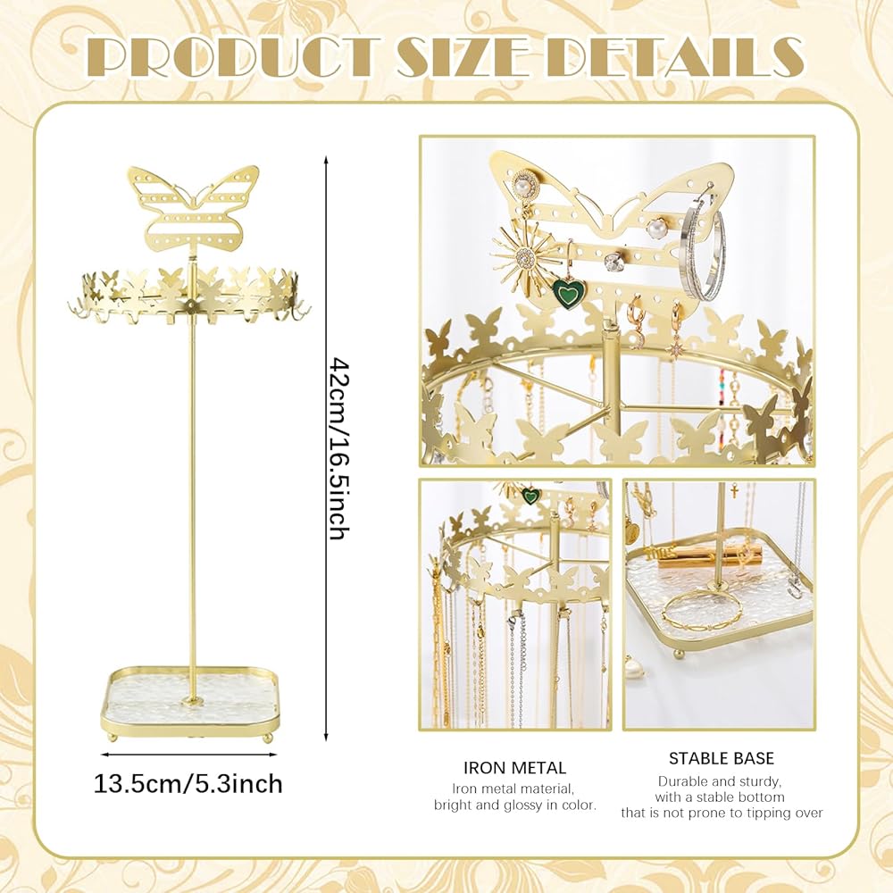 Exquisite and Practical: This jewelry display holder is designed with great elegance, featuring a large golden butterfly at the top that has holes for storing your earrings; The bottom tray of the necklace stand can also accommodate watches, lipsticks, bracelets, rings, and earrings