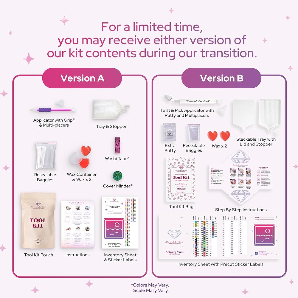 INCLUDED: A 9" x 10" (22.8cm x 25.9cm) full-drill canvas, round diamonds in 57 colors with 1 aurora borealis diamonds and 3 fairy dust diamonds, twist & pick applicator with putty and multiplacers, stackable tray with lid and stopper, inventory sheet with pre-cut sticker labels, and resealable baggies.Diamond count: 7,802