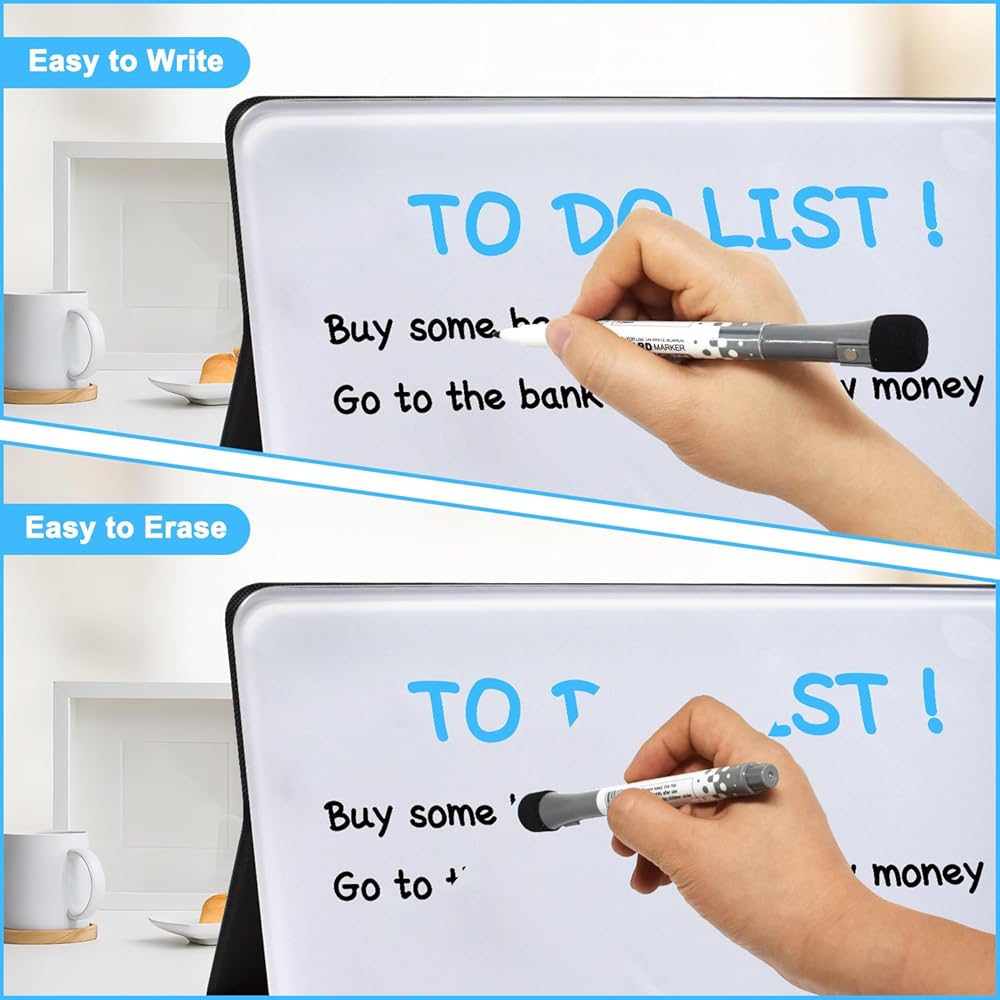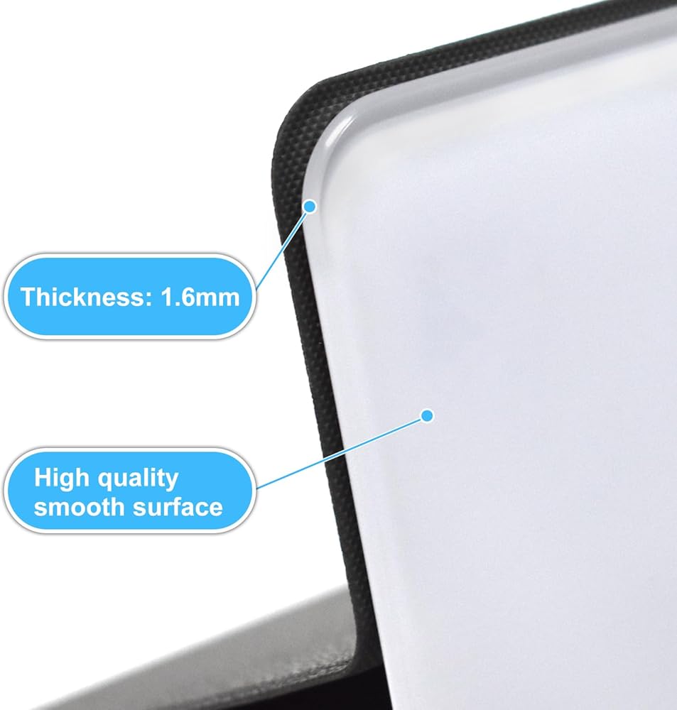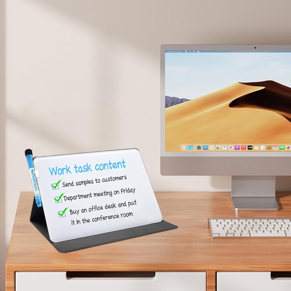 The GlossyEnd Nice & Elegant Desktop Glass Whiteboard, is your new desk buddy, always ready for action. Its foldable PU leather cover keeps it protected and within reach for those urgent notes. Equipped with a marker and holder, it's the ultimate tool for staying organized and efficient. Keep your thoughts clear and accessible with this handy companion, transforming your workspace into a hub of productivity and creativity.Size 11.8" X 7.8"